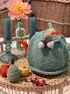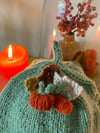 The cutest tea-cosy knitting pattern with a choice of two adorable adornments; the Acorn & Oak Leaf and the Pumpkin and Ivy Leaf, by Alitzah Grant Designs.