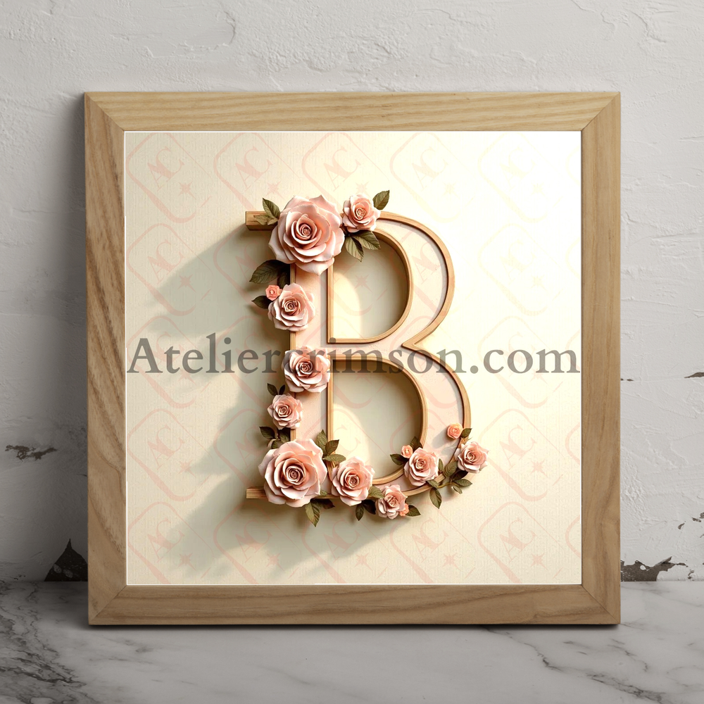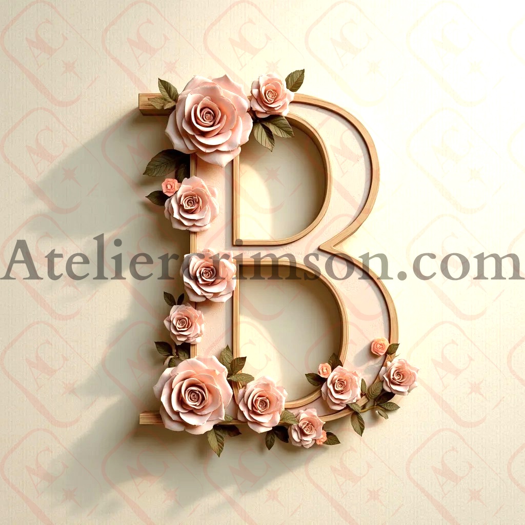 The letter B soft beige wood and flowers Download now this AI-generated image of an elegant, mid-century style character crafted from wood with a soft, neutral background with geometric pattern. Nostalgic and elegantly worn atmosphere.