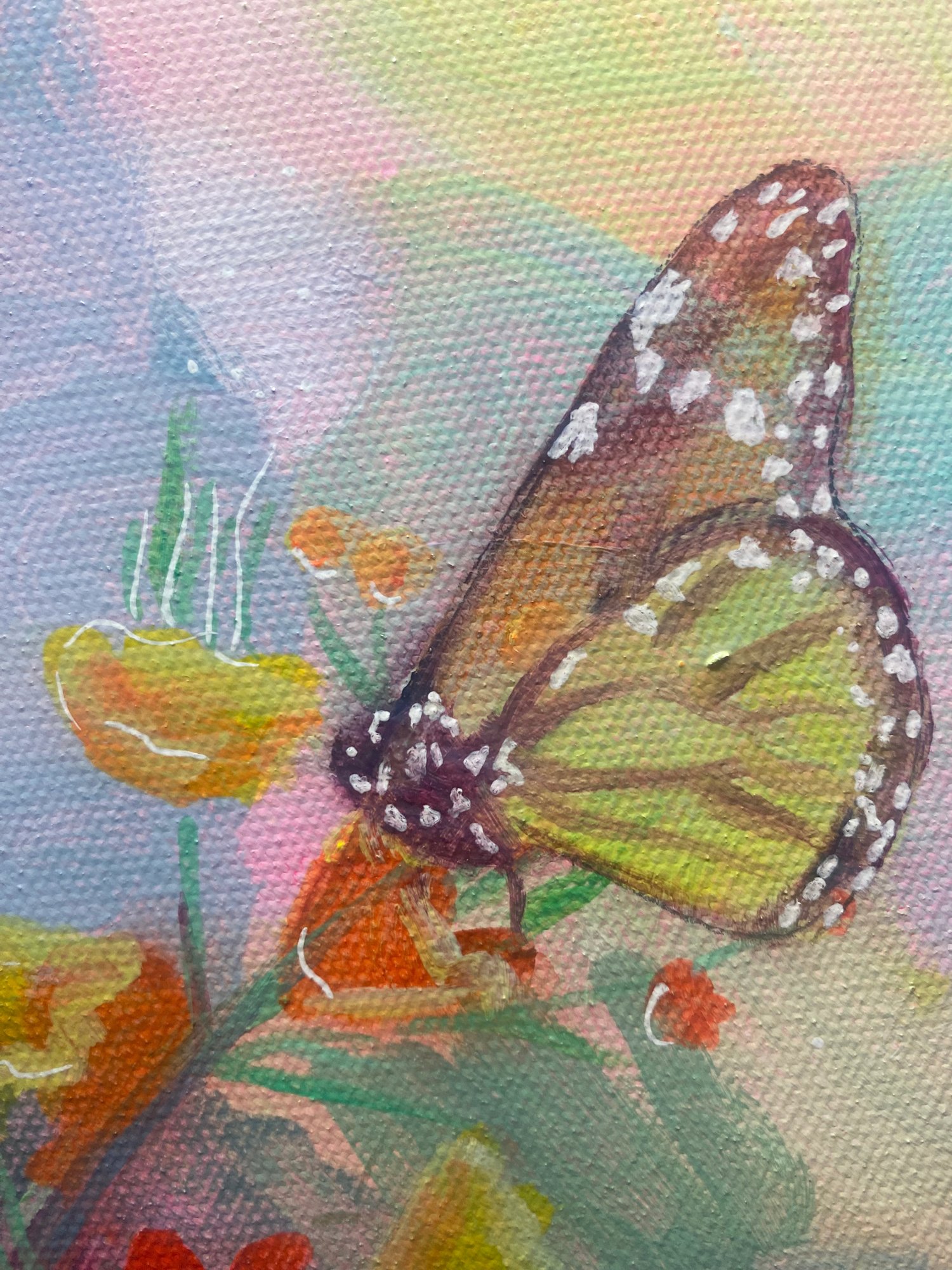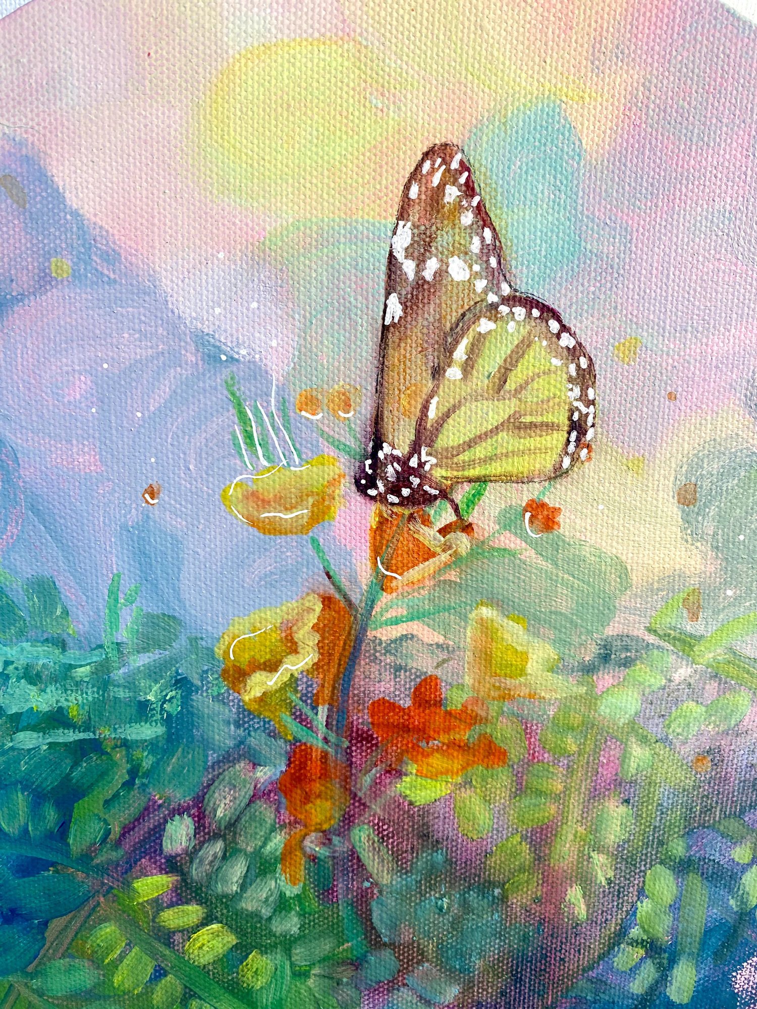 Because joy doesn't always look the way you expect it to. "Goat Yoga" is pure whimsy — the kind of painting that makes you smile before you even know why. Painted on a round canvas in soft acrylic, this playful little piece brings light and laughter to any space. Created after I did yoga with playful goats crawling all over me, these gorgeous orange flowers surrounded the space. For the collector who takes their healing with a side of delight. Because sometimes the most sacred thing you can do is laugh.