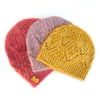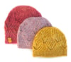 Sunset Slouch is knit in the round using short or long circular needles, starting with a bit of twisted ribbing. The pattern comes in two sizes (small or large) and two styles (beanie or slouch). The length can be further adjusted within the stitch pattern depending on the degree of slouch you prefer.