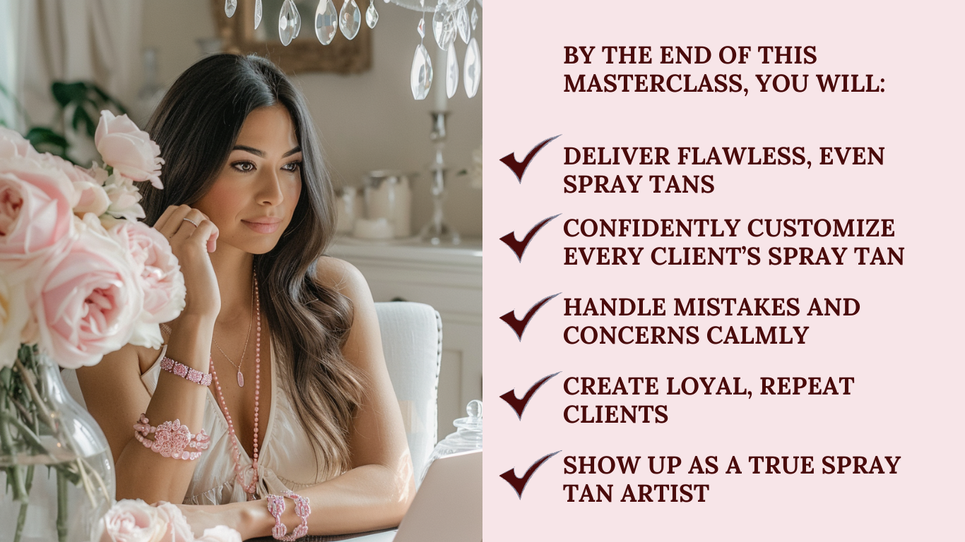 The Sunless Confidence Masterclass is a professional-level masterclass for spray tan artists who want to show up with authority, communicate with confidence, and run their business like a booked-out pro — not a hobbyist.