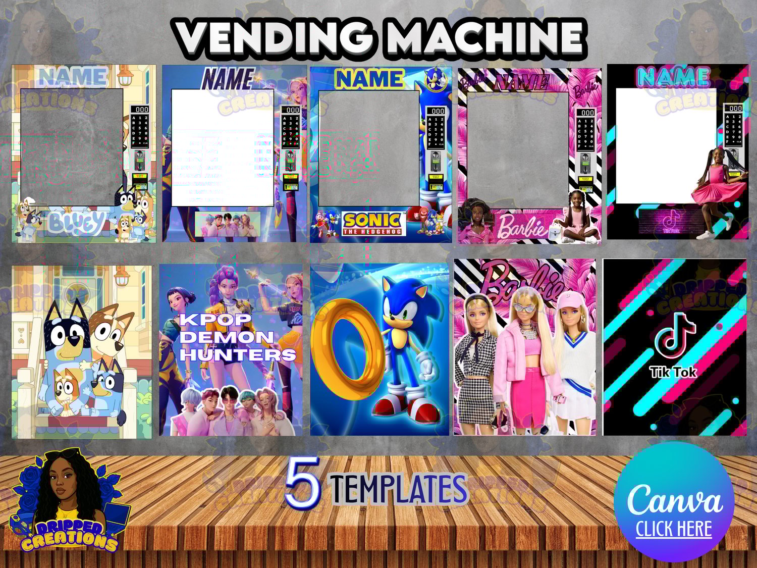 - 5 editable vending machine–style templates