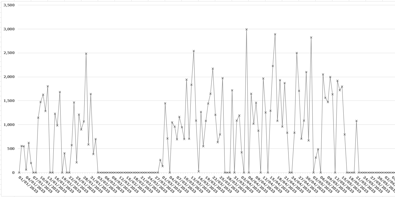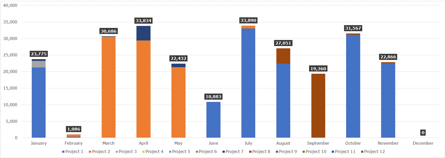 - Total word counts for each month displayed in stacked columns so you can see which projects you worked on.