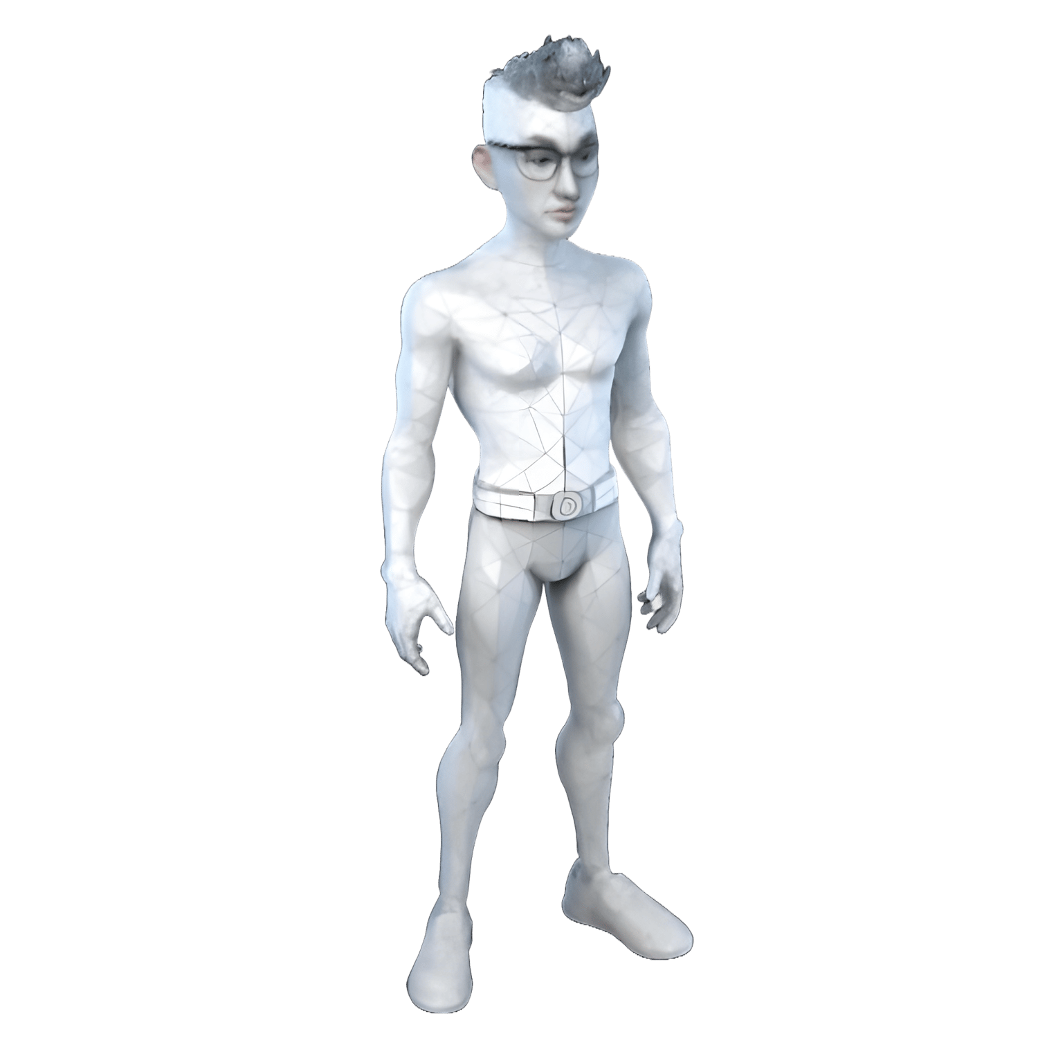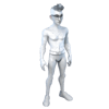 - A stylized white humanoid figure with a distinctive hairstyle and belt
