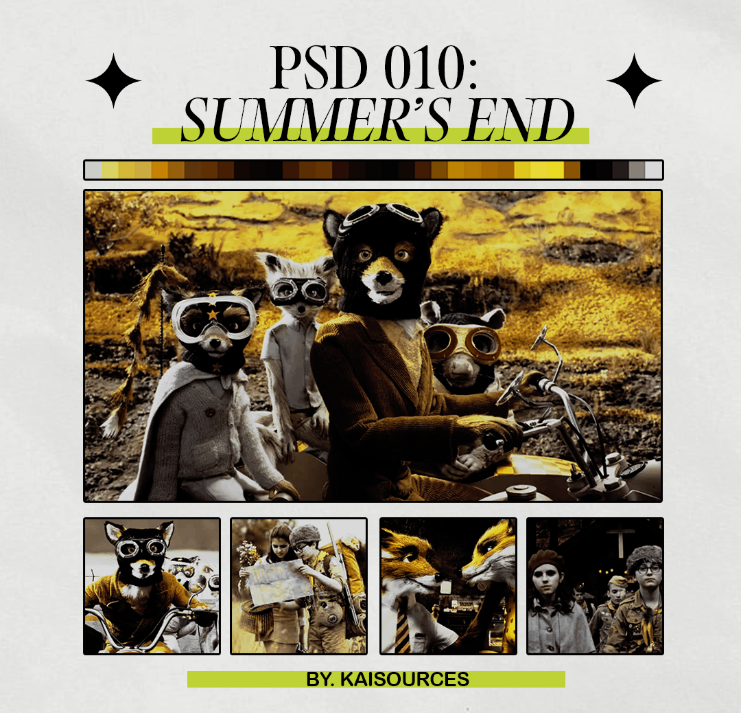 colouring psd inspired by Wes Anderson's works: Mr. Fantastic Fox & Moonrise Kingdom. will change red - dark blue to brown and black; light blue to bright yellow to white . do not claim / redestribute it on your own. previously known as kaiserscomms but kaisources is opening commissions as well!