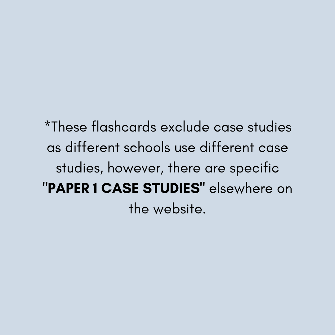 *These flashcards exclude case studies as different schools use different case studies, however, there are specific "PAPER 1 CASE STUDIES" elsewhere on the website.