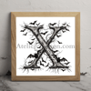 The letter X coloring book halloween occupying 90% of a 1024x1024 image. Use an Old English font style with clear outlines resembling a coloring book page. The character is composed of intricate bat silhouettes, creating a spooky Halloween atmosphere. Use only pure black (#000000) for the character and outlines, and white for the background.2D, black and white style resembling a high-quality adult coloring book page.