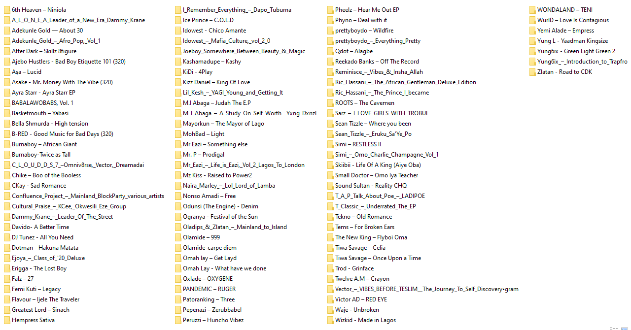 Está una compilación 100 álbums de música "afropop", que cuenta con una gran variedad de artistas con diversos géneros y estilos.