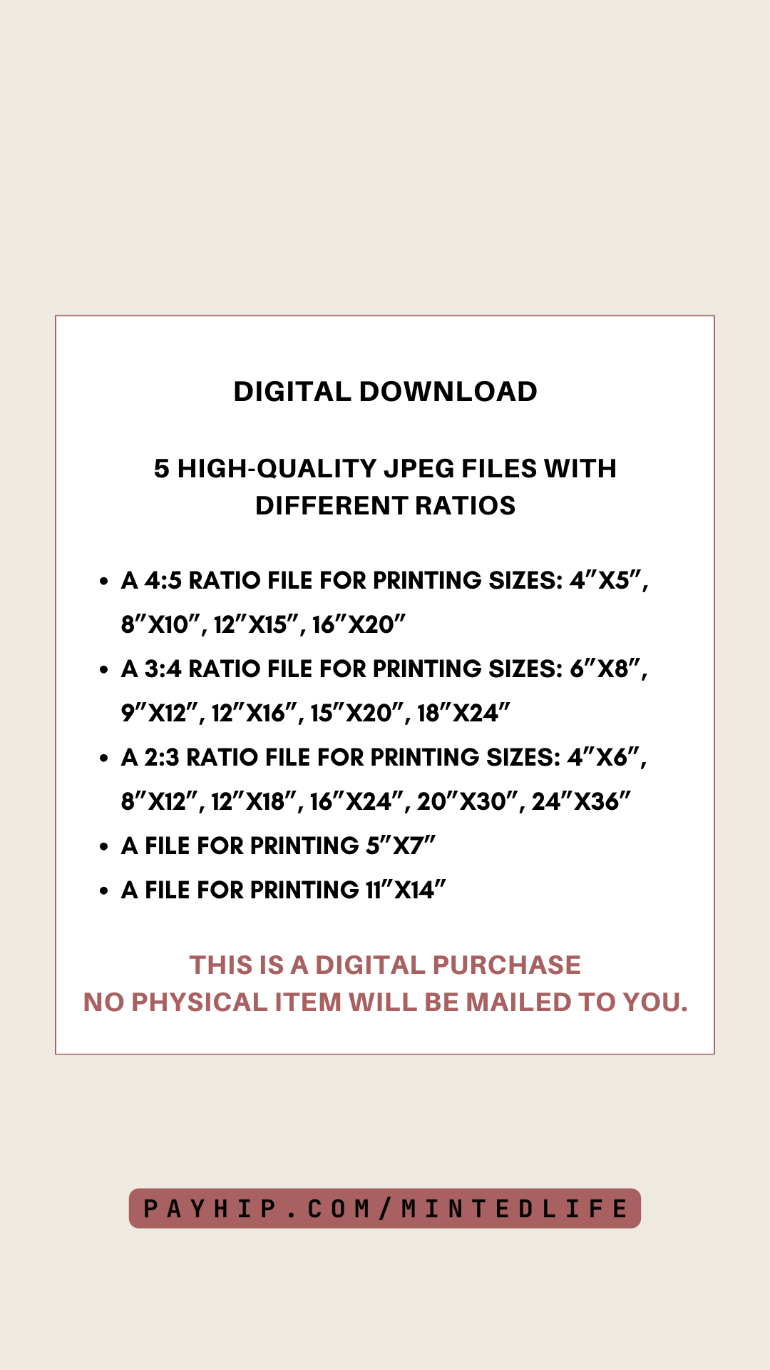A 3:4 ratio file for printing sizes: 6”x8”, 9”x12”, 12”x16”, 15”x20”, 18”x24”