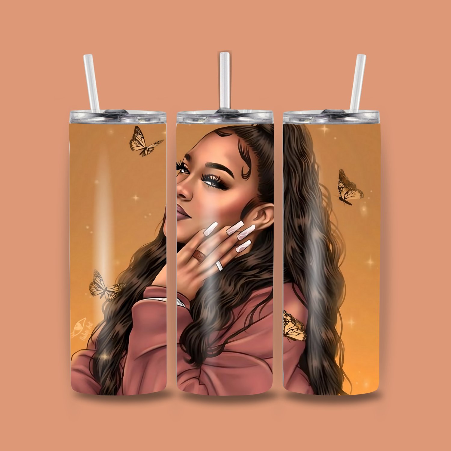 Bring soft glam and golden warmth to your everyday routine with this Golden Glow Butterfly Beauty 20oz Skinny Tumbler. Featuring a stunning illustration of a beautiful woman with long flowing hair, soft glam makeup, and fluttering butterflies, this tumbler delivers an elegant aesthetic that feels calm, feminine, and effortlessly stylish.