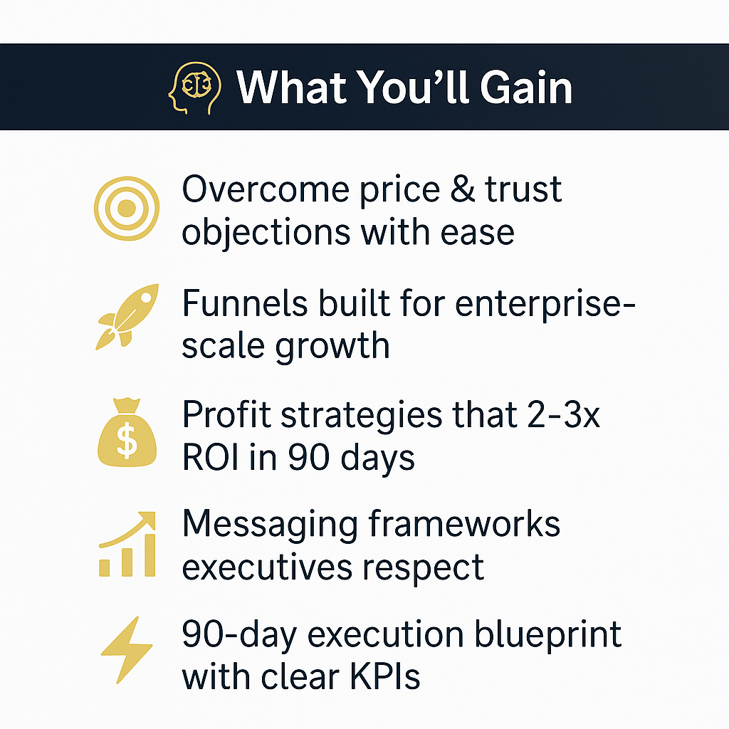 This system is built for CMOs, CFOs, CEOs, and enterprise consultants ready to scale brand awareness, reduce wasted spend, and increase ROI by 200–300% in as little as 90 days.