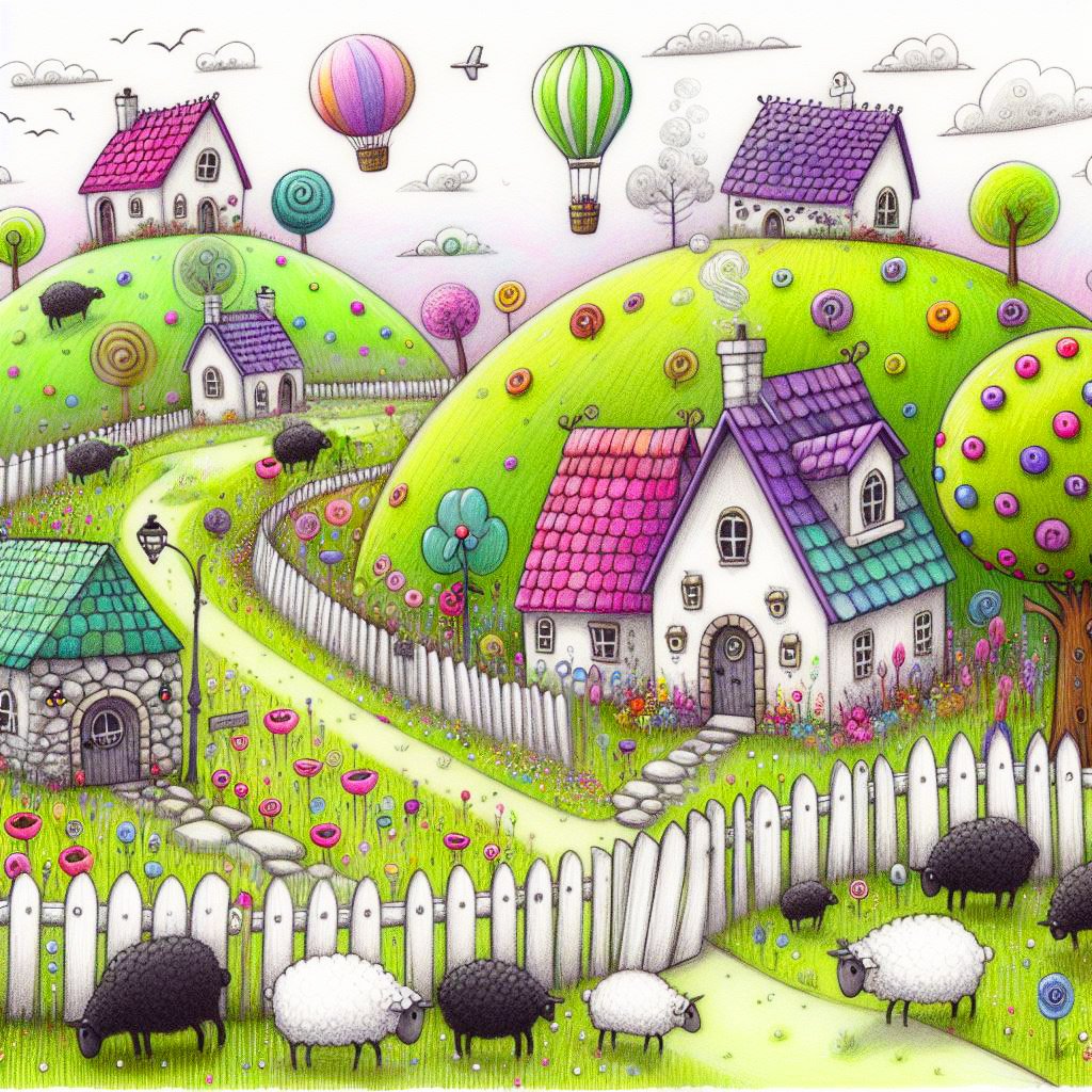 A whimsical world. Houses made of bright colourful pebbles with white picket fences. fields with black & white sheep. There are big round hills with poppies & a hot air balloon. There are birds flying in a cloudy purple sky.