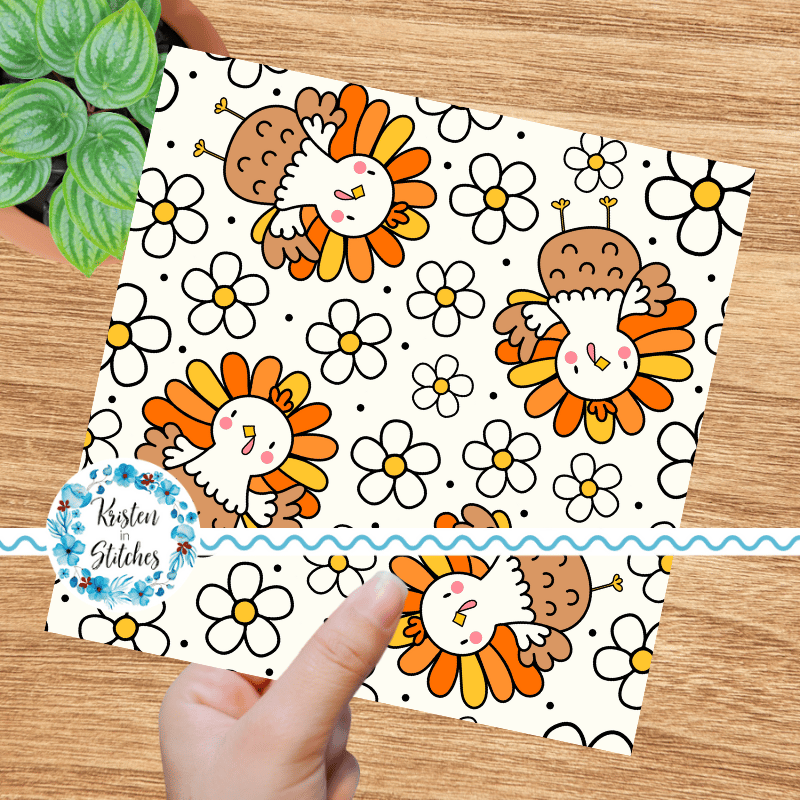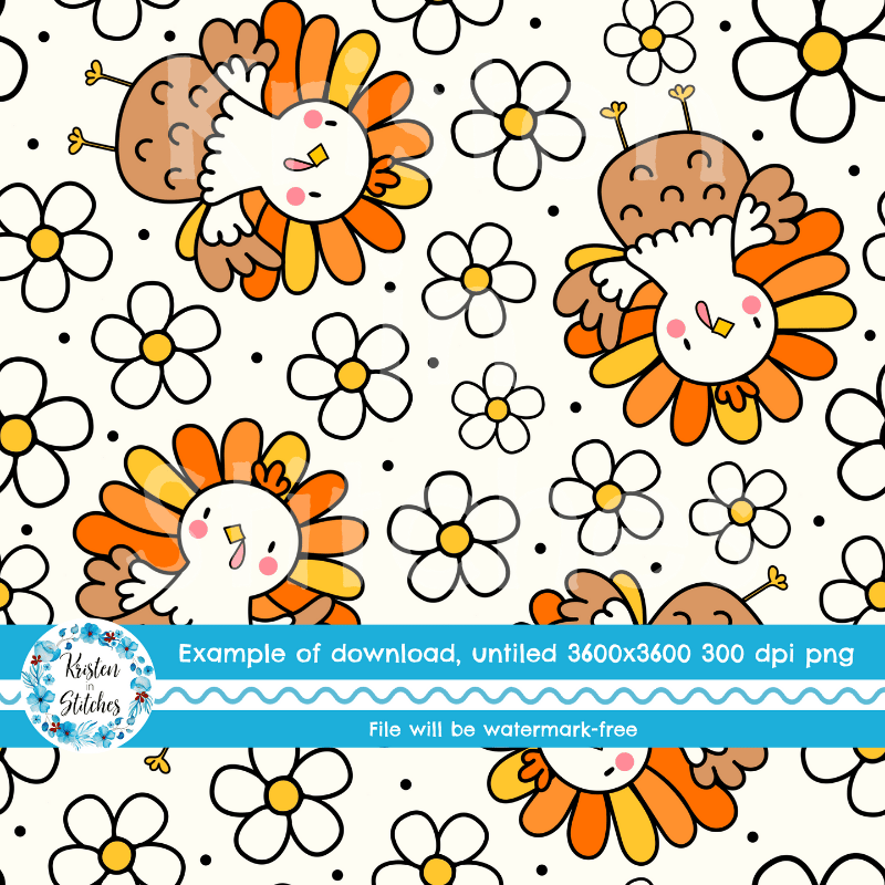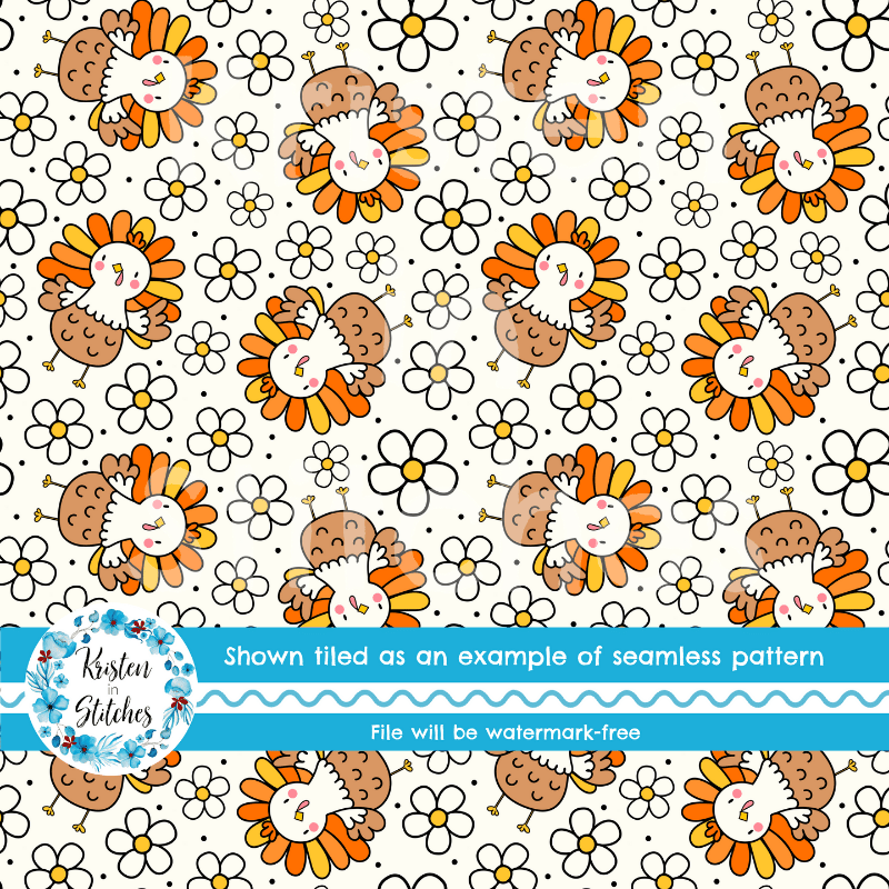 Sweet Thanksgiving Turkeys and Daisy Flowers Seamless Pattern