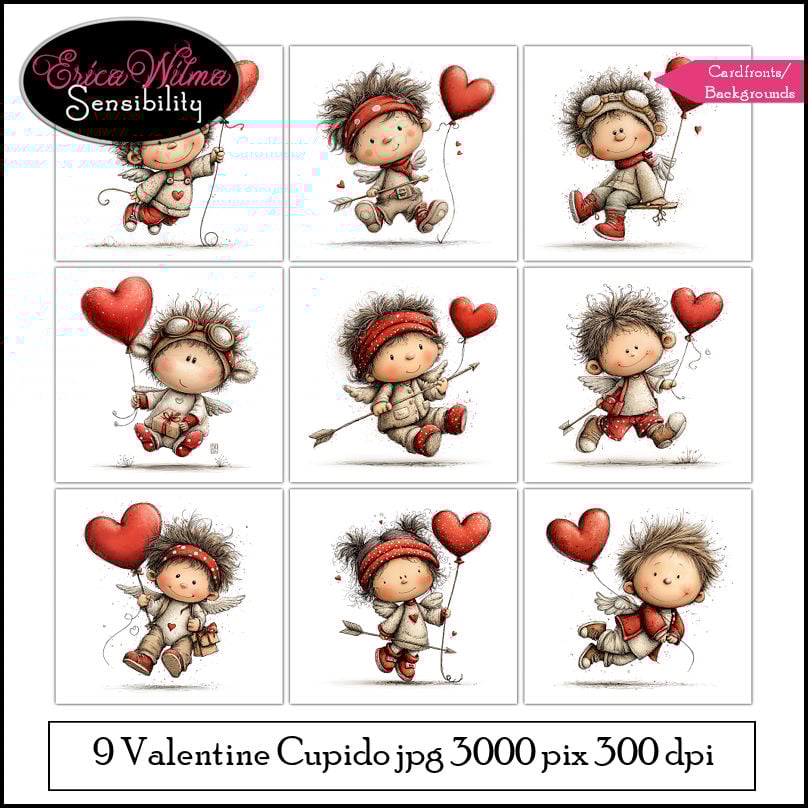 This collection features charming little cupids with fluffy hair, tiny wings, and heart-shaped balloons, all illustrated in a soft, whimsical style that instantly brings a smile.