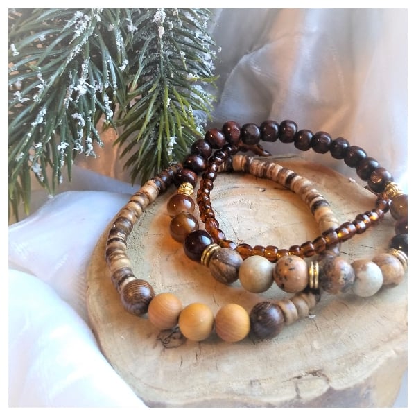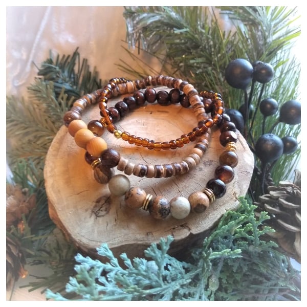Warm Cedar, Picture Jasper, and Coffee colour Agate are all combined to create this unisex stack. Balance emotions, calming and assist in protection from negativity. Cedar beads are used for your oils if you like but I just enjoy the scent of cozy winter cedar even when going for a walk I rub the cedar leaf between my fingers and love the scent. Warm Cedar and coffee colour Agate, enjoy a walk in the woods. For protection and feelings of calmness.
