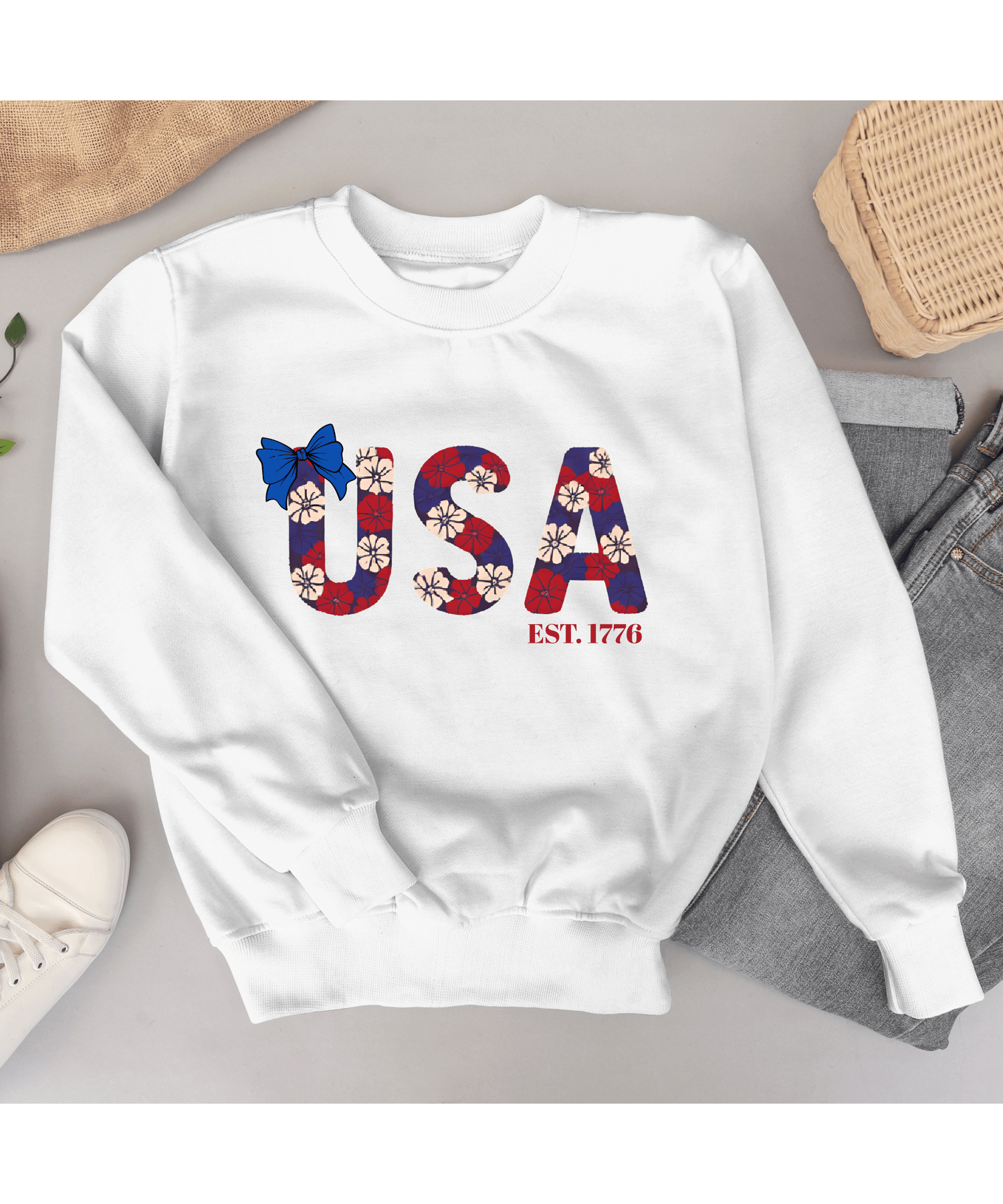 Celebrate Independence Day in sweet, preppy style with this Coquette Floral USA PNG! Featuring a chic mix of red, white, and blue florals arranged in a playful yet elegant design, this file is perfect for creating standout 4th of July t-shirts, tote bags, party decor, and more.