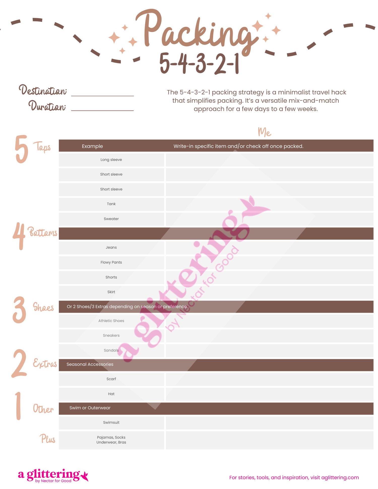 The 5-4-3-2-1 packing strategy is a minimalist travel hack that simplifies packing. It’s a versatile mix-and-match approach for a few days to a few weeks.