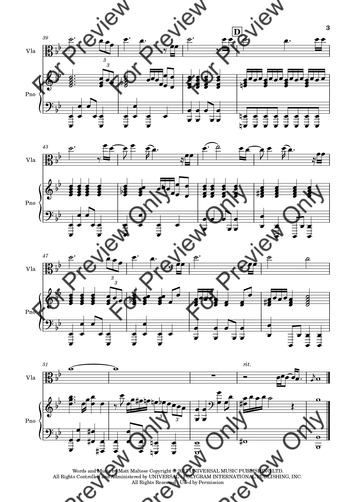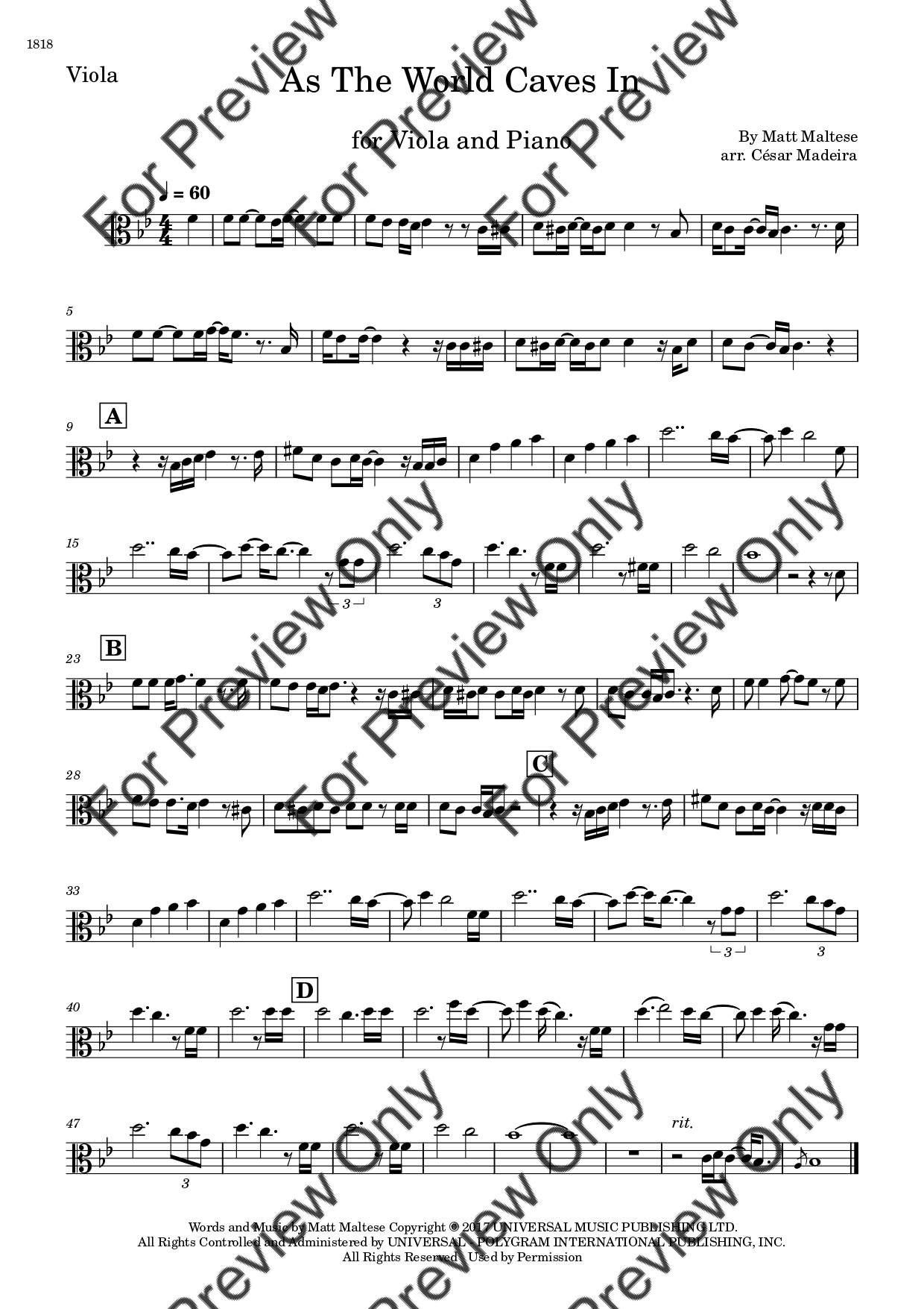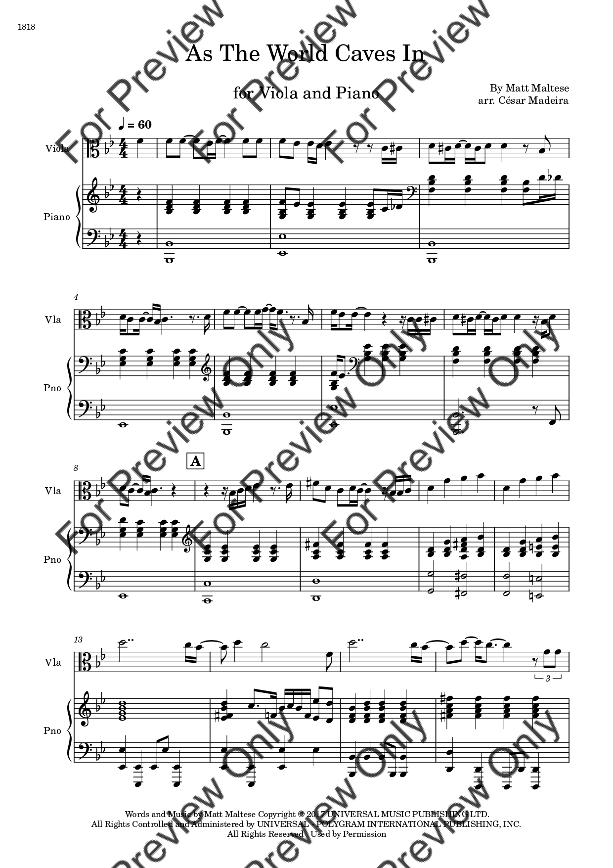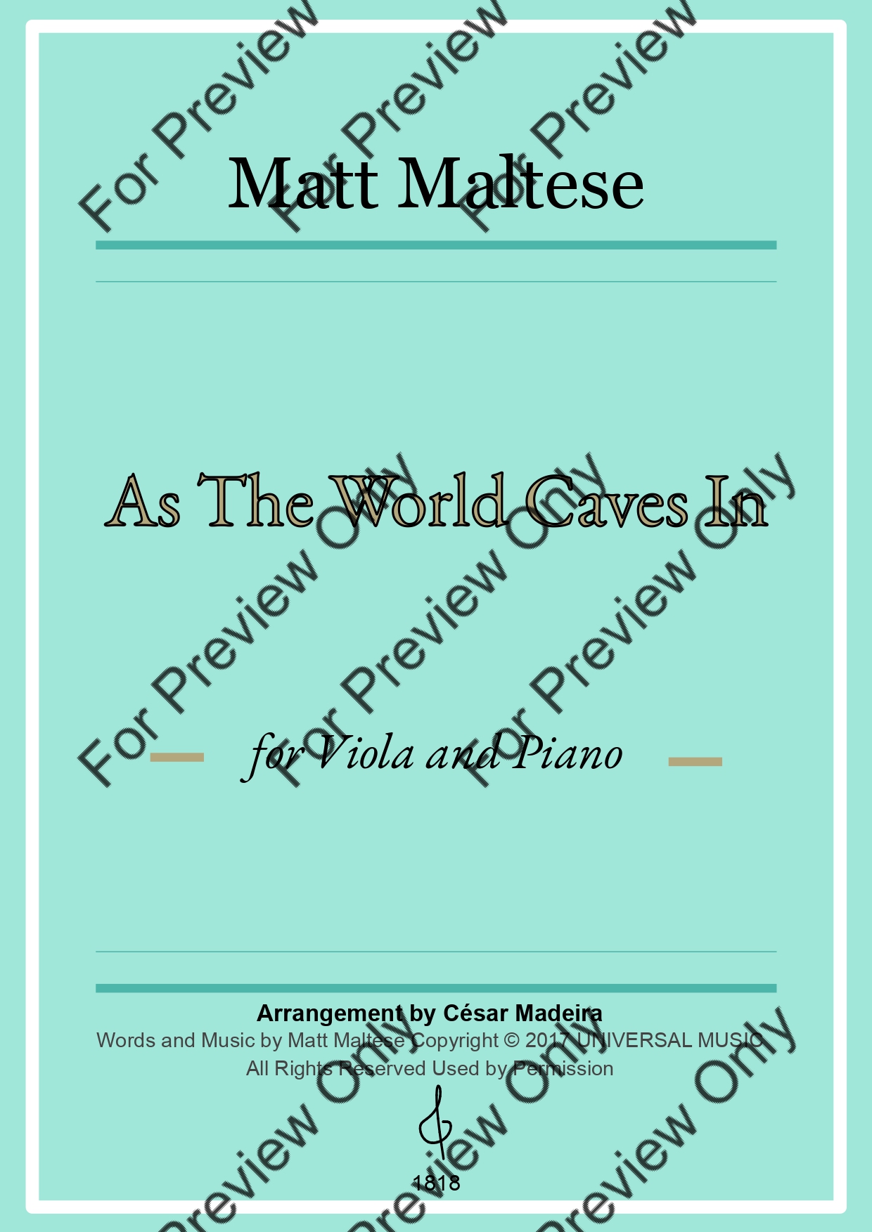As The World Caves In by Matt Maltese. Arrangement for Viola and Piano. With Full Score and Individual Parts. Have fun!
