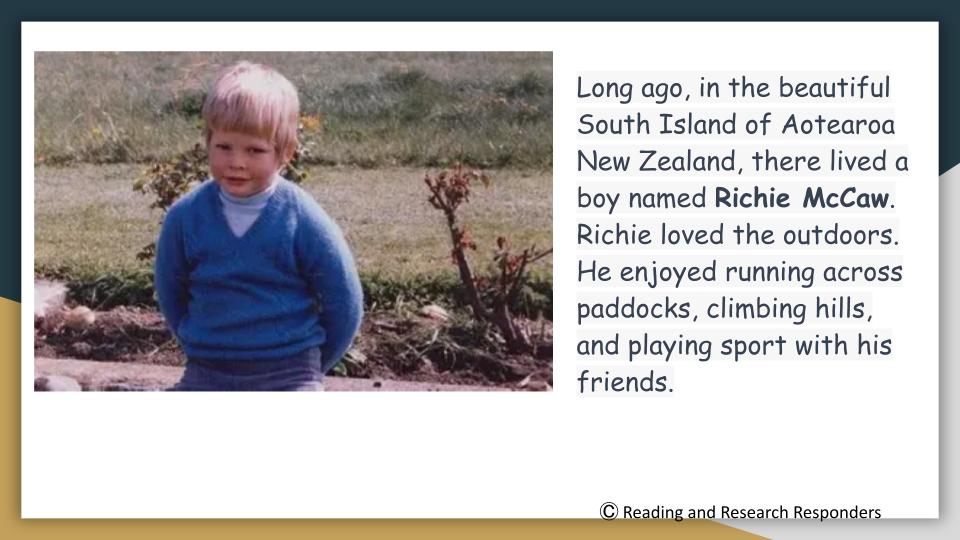 This child-friendly, values-based tale explores the life of All Blacks legend Richie McCaw, focusing on:
