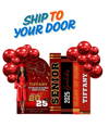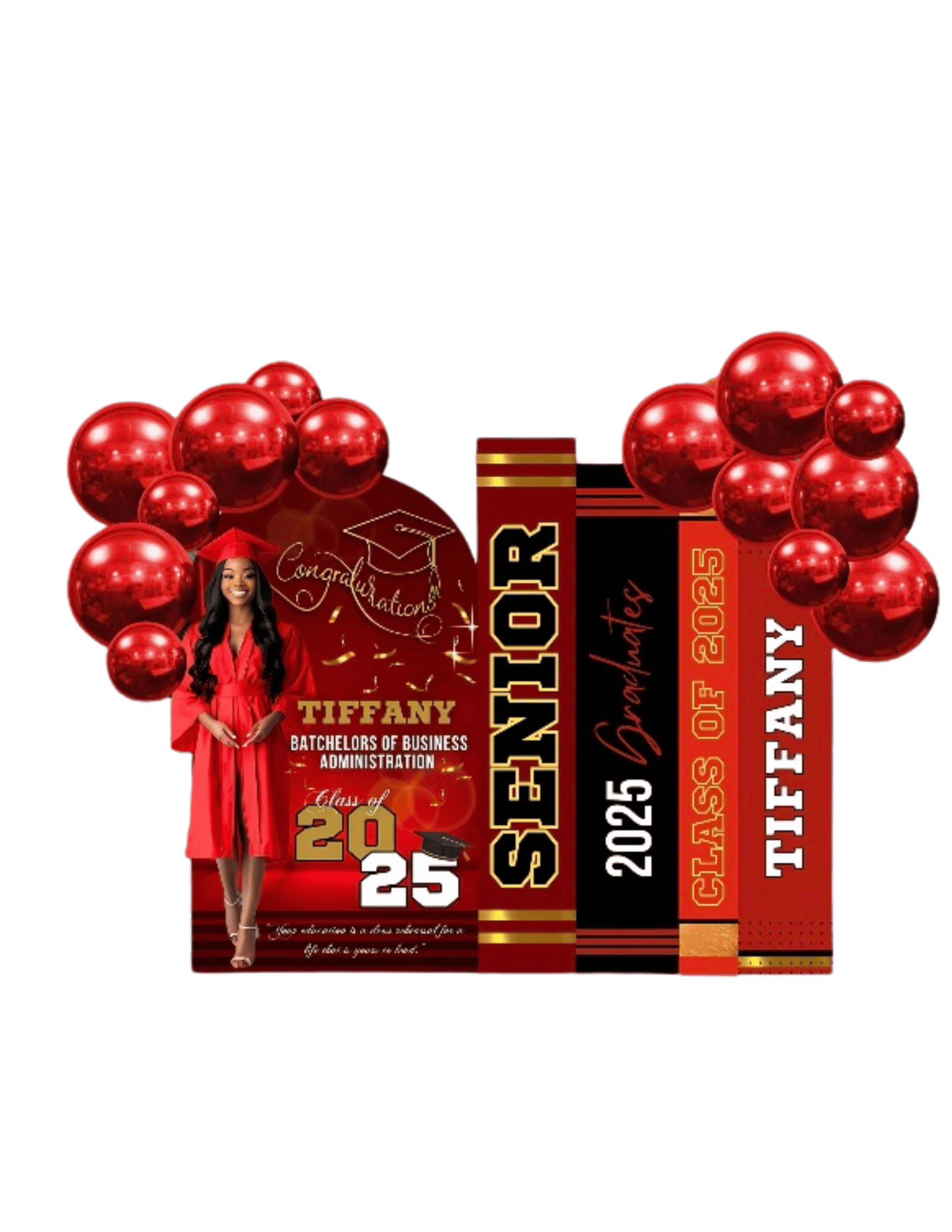 The Red Grad Grab and Go-Ship to You. This product includes one 7ft Arch and one set of 3 Books Coroplast boards with stands. (Balloons are not included) This is a quality professional grade printed product that will stand out. This order will be created with your graduate's picture, school information and year of graduation.