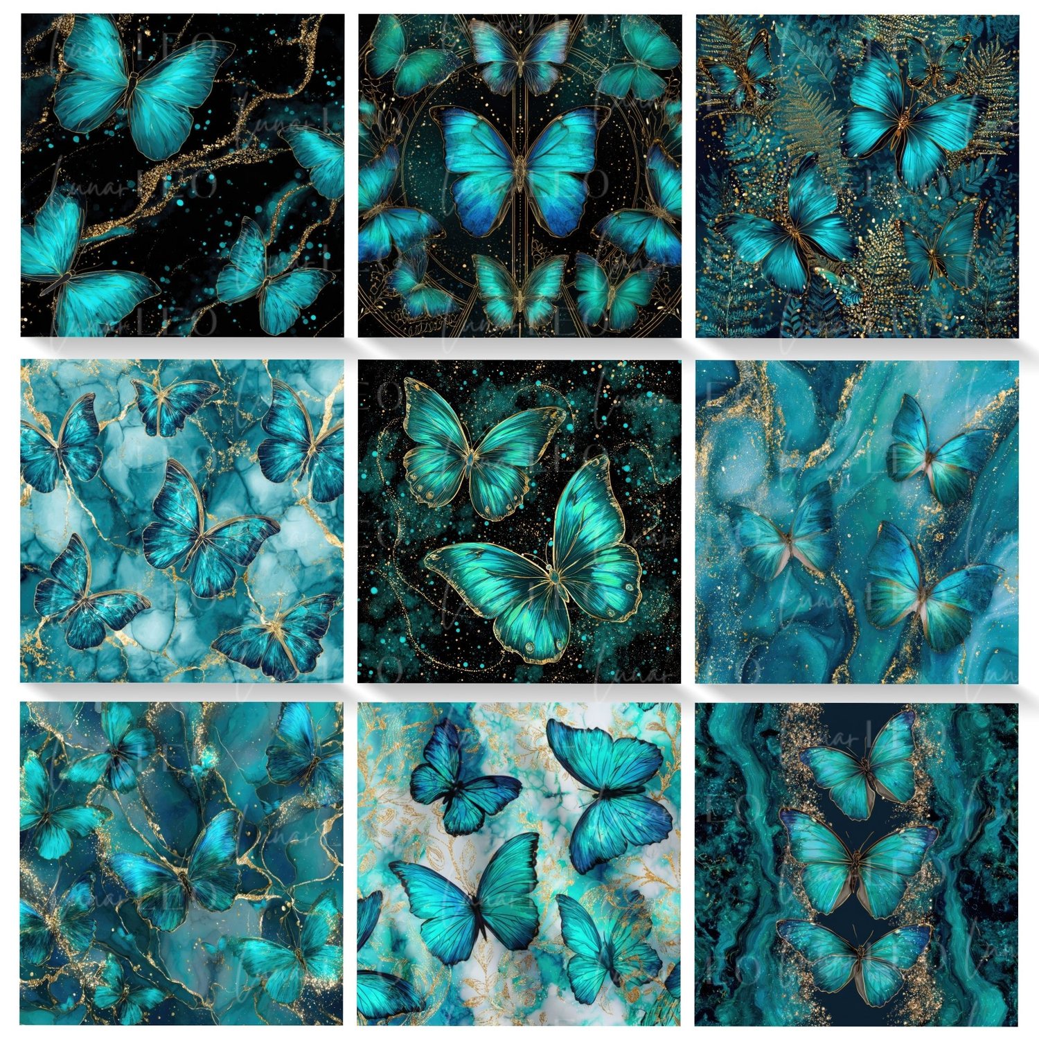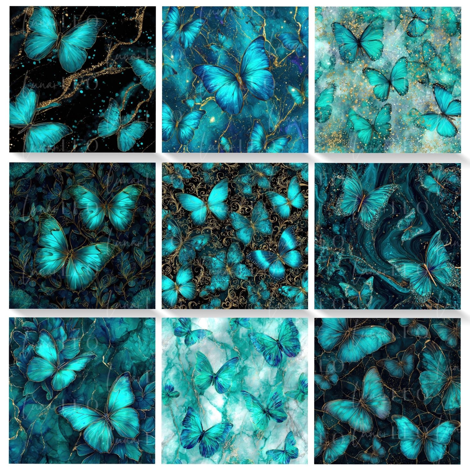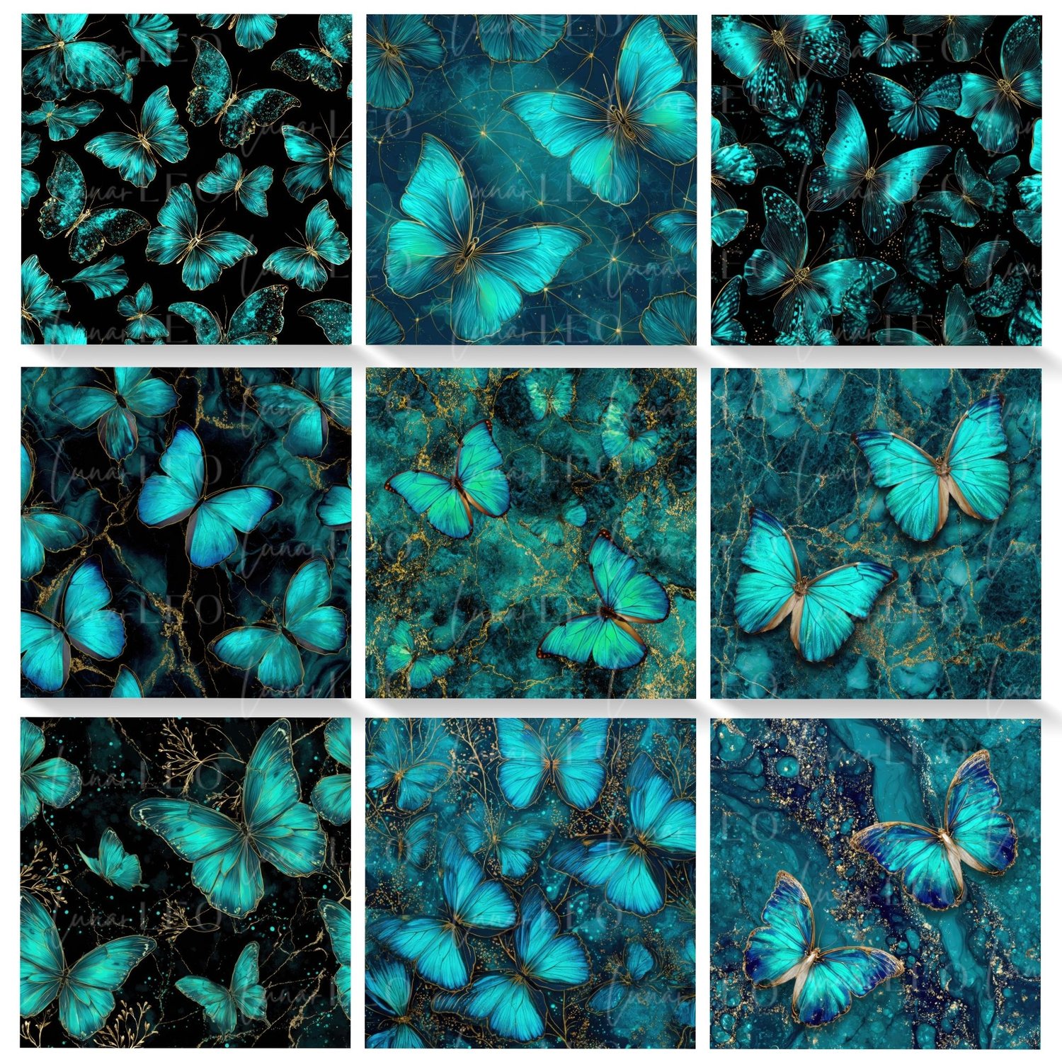 Bring elegance and ethereal energy to your next project with this turquoise butterflies digital paper pack. Featuring rich teal, aqua, and gold butterfly illustrations over luxe marble and agate-style backgrounds, this set includes 37 unique 12x12" JPGs designed for spiritual creatives, metaphysical businesses, and intentional design.