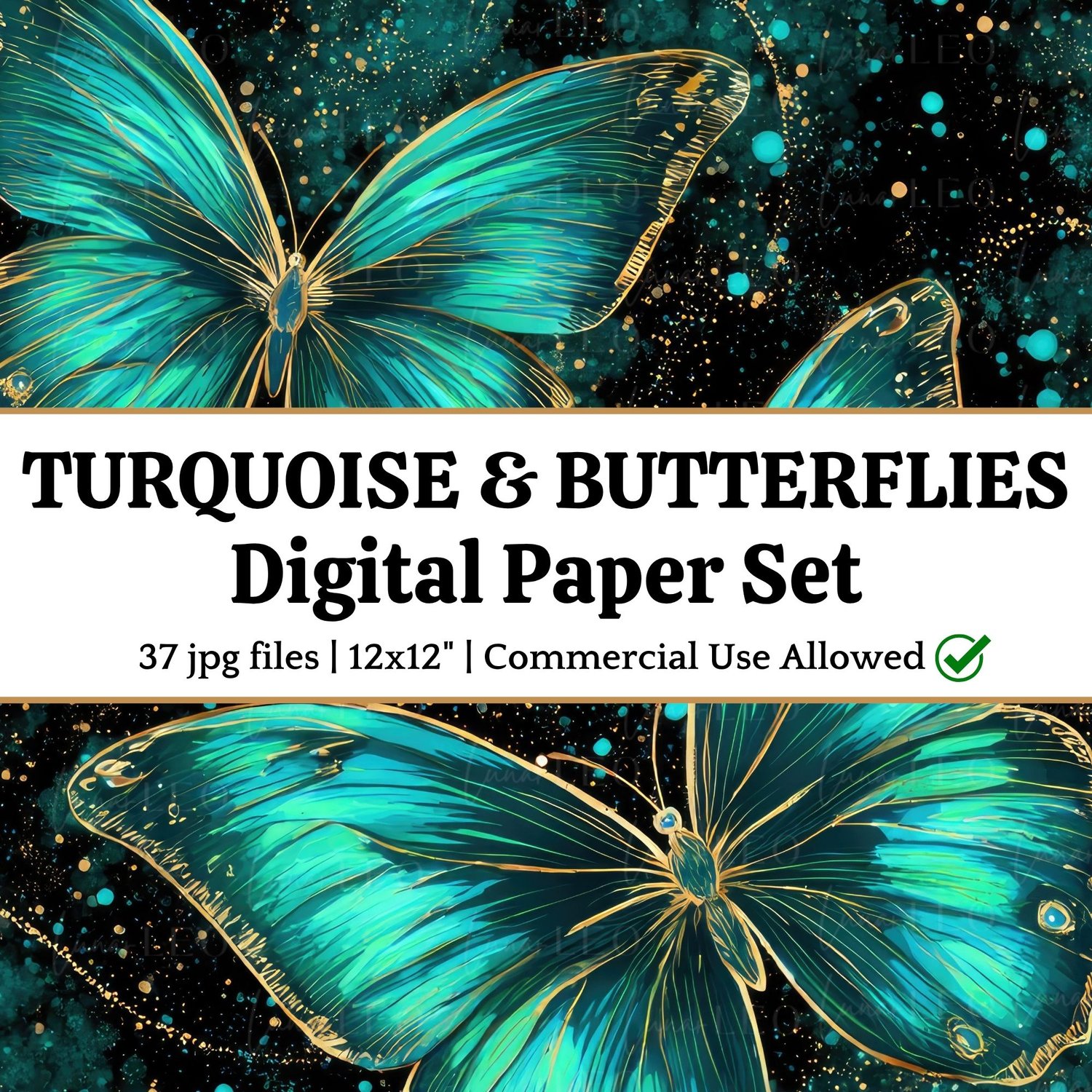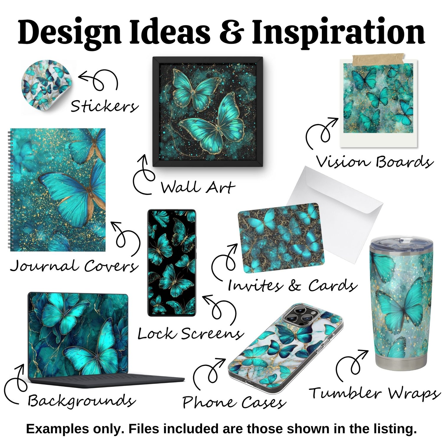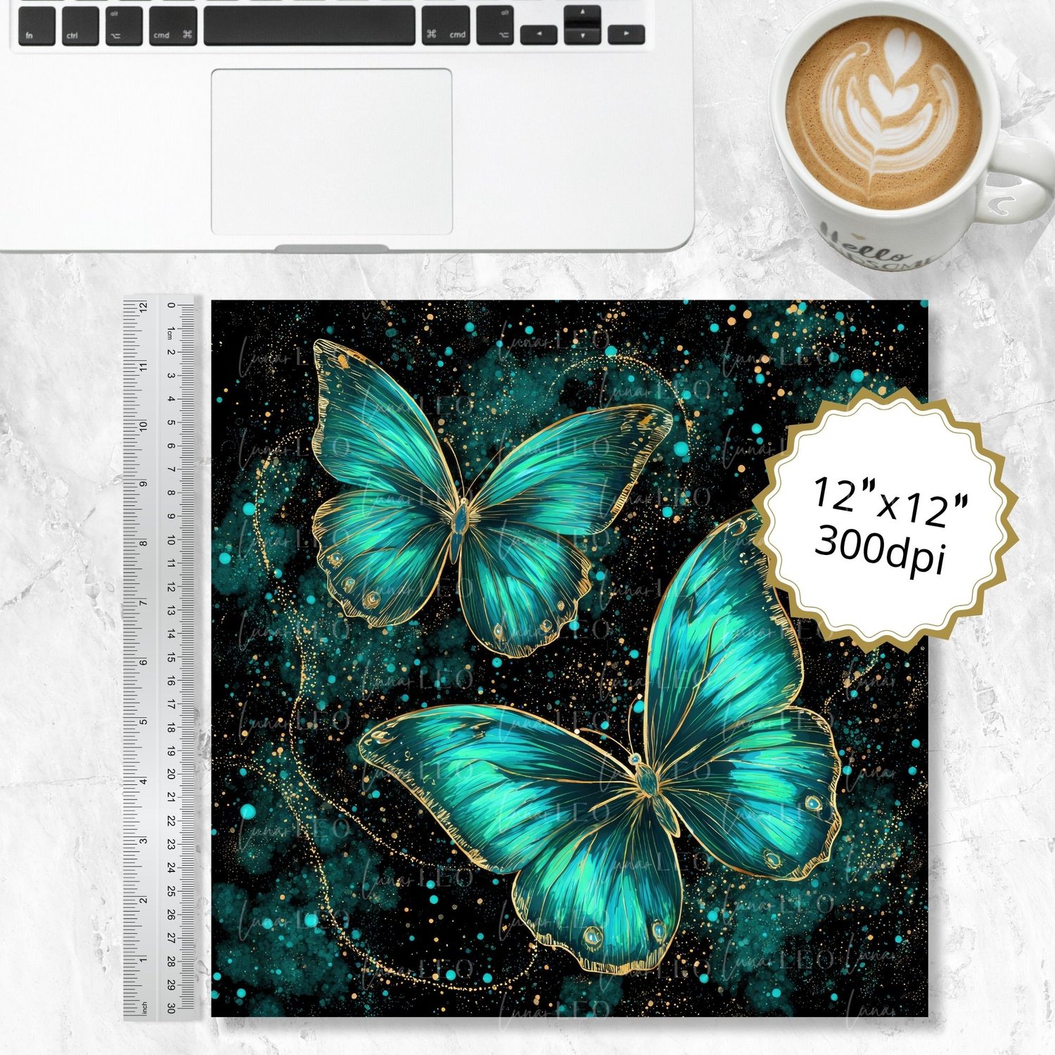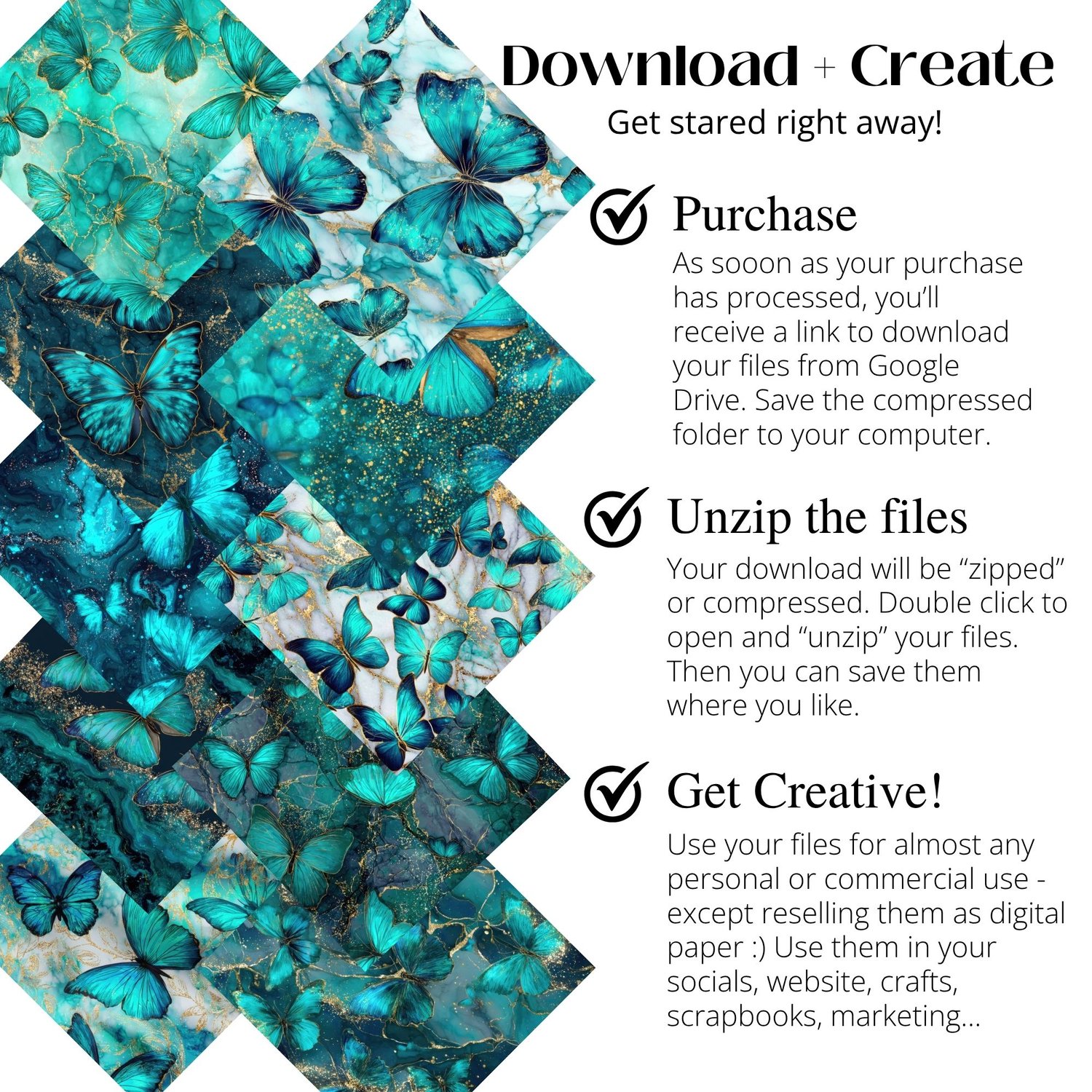 Bring elegance and ethereal energy to your next project with this turquoise butterflies digital paper pack. Featuring rich teal, aqua, and gold butterfly illustrations over luxe marble and agate-style backgrounds, this set includes 37 unique 12x12" JPGs designed for spiritual creatives, metaphysical businesses, and intentional design.