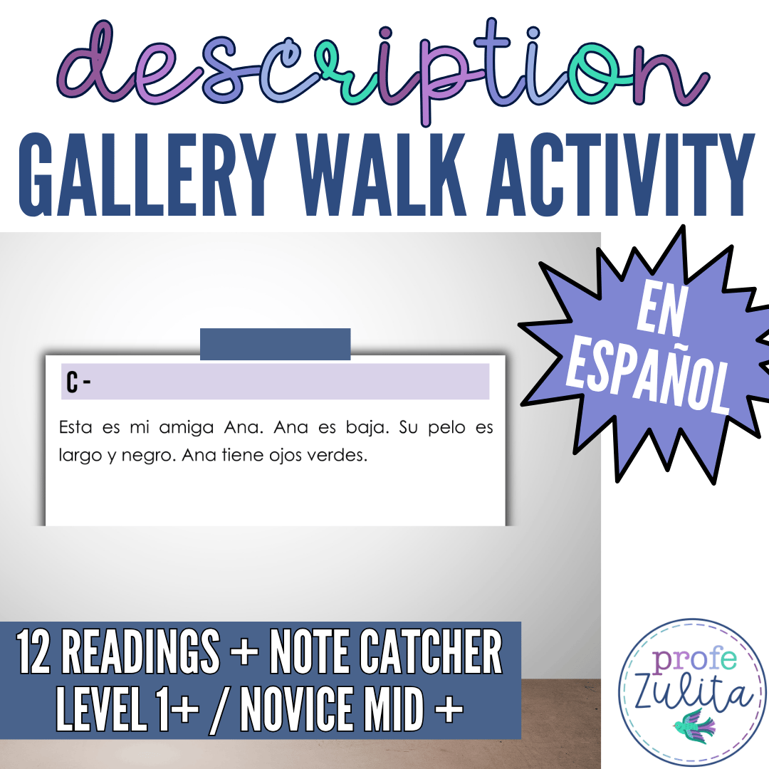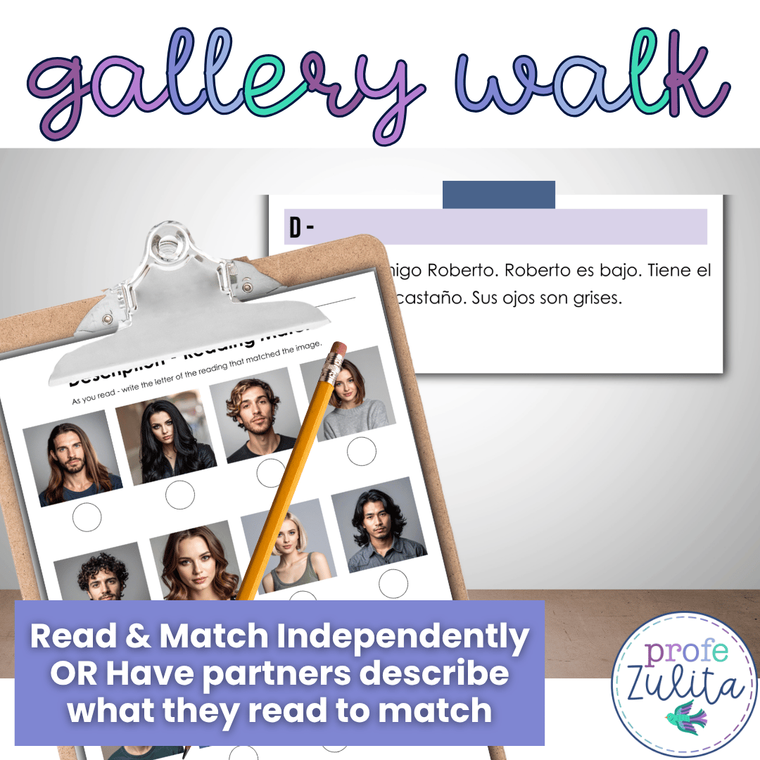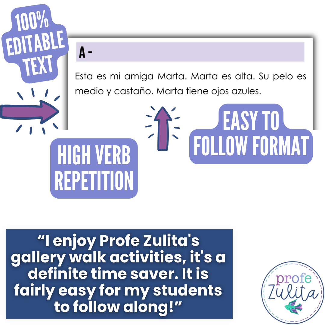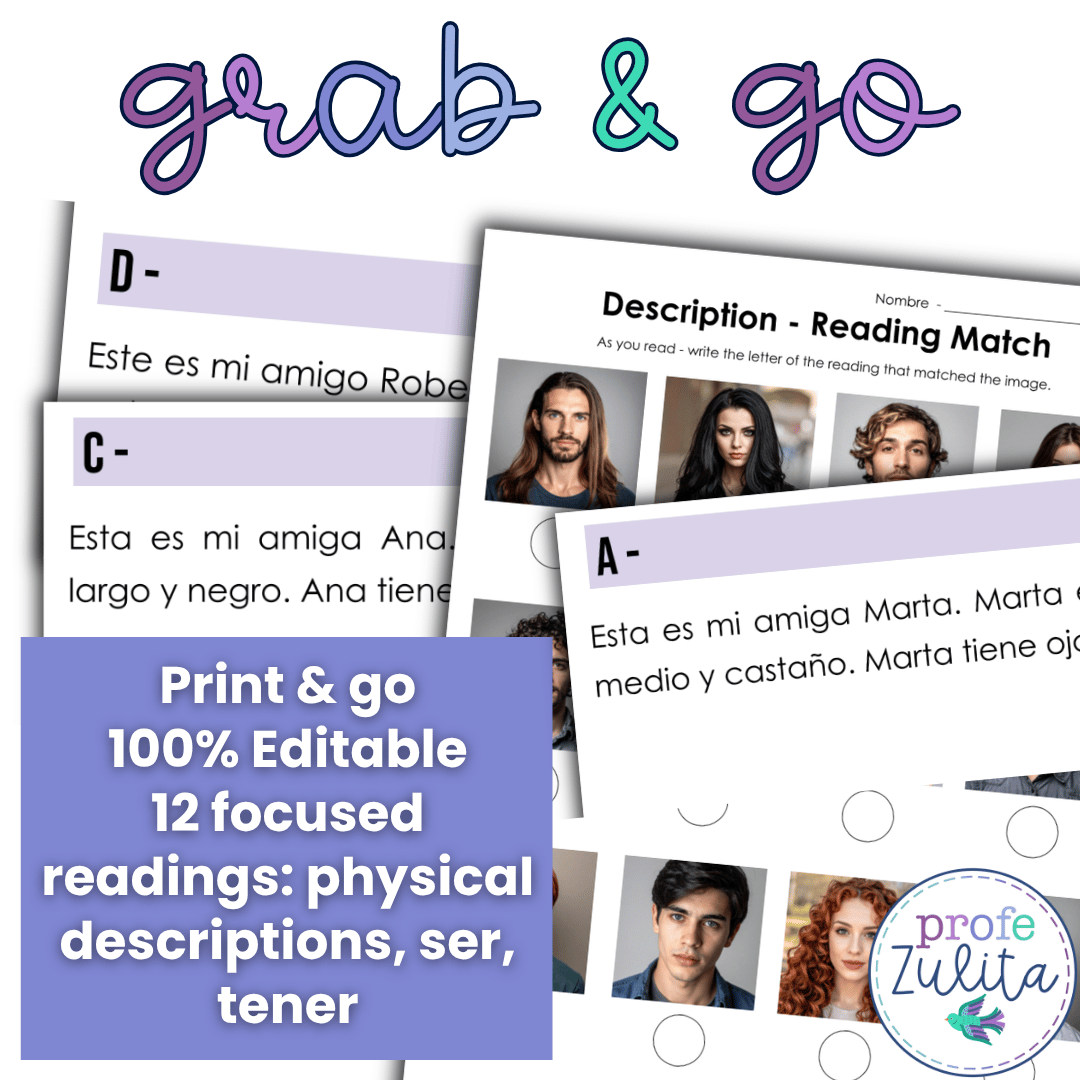 This gallery walk will provide your students with 10 focused readings written to provide structured input with Spanish physical descriptions & structured phrases used with the verbs ser & tener in Spanish. Your student will read a description of someone and match it to a picture.