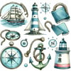 Watercolor nautical clipart refers to digital or physical illustrations that feature maritime-themed elements, painted in a watercolor style. These clipart images often have a soft, fluid, and slightly transparent appearance, characteristic of watercolor paint. The nautical theme ties these elements to the sea, sailing, and coastal life.