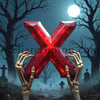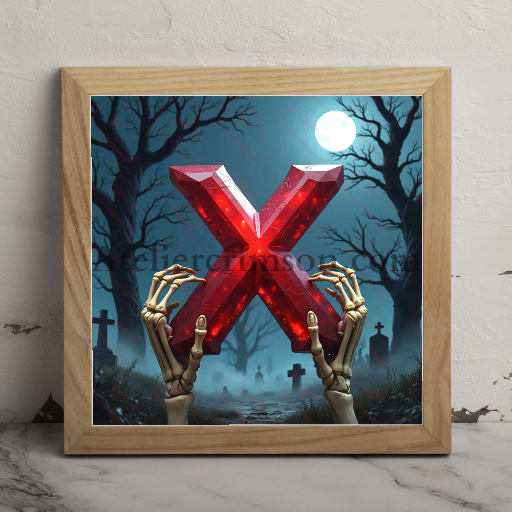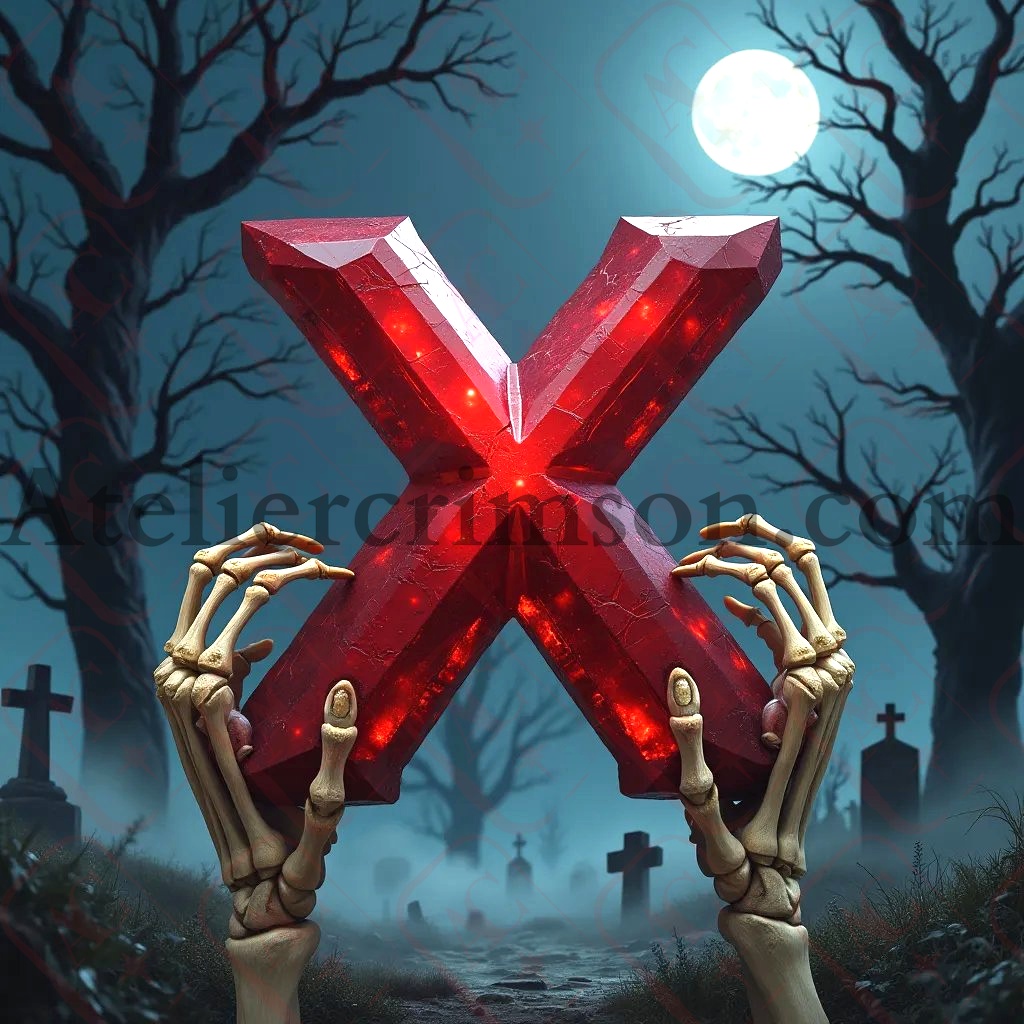 The letter X ruby halloween skull Discover our eerie alphabet series featuring photorealistic ruby letters and numbers. Each character, crafted from deep red gemstone, floats mysteriously in a misty graveyard. Skeletal hands frame these gleaming symbols against a moonlit, Halloween-inspired backdrop. Perfect for gothic design projects or seasonal decor inspiration!