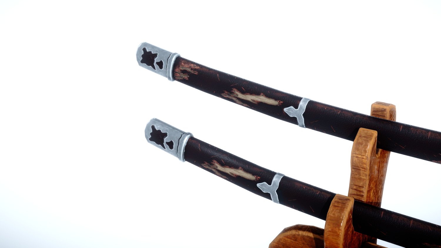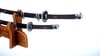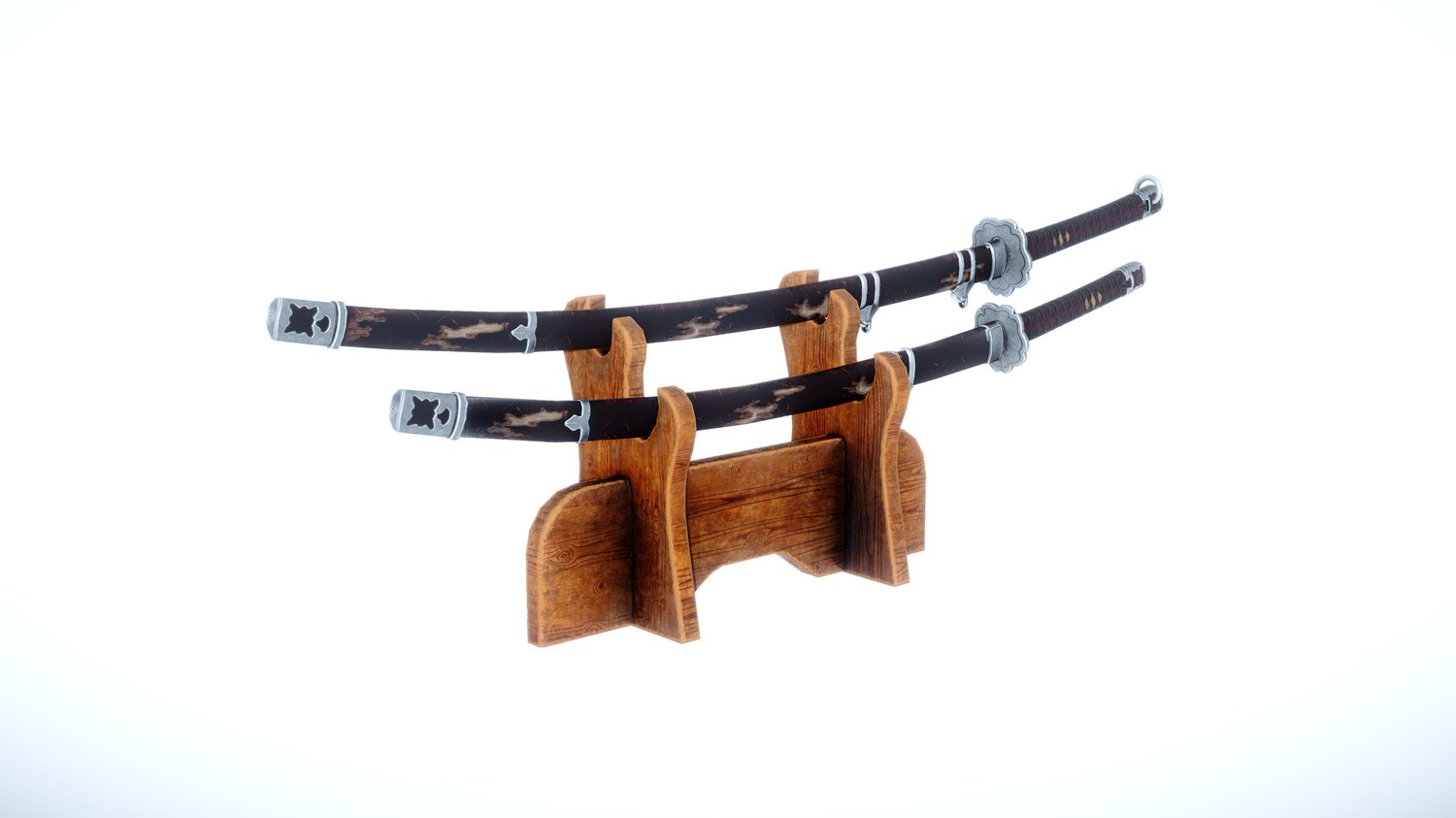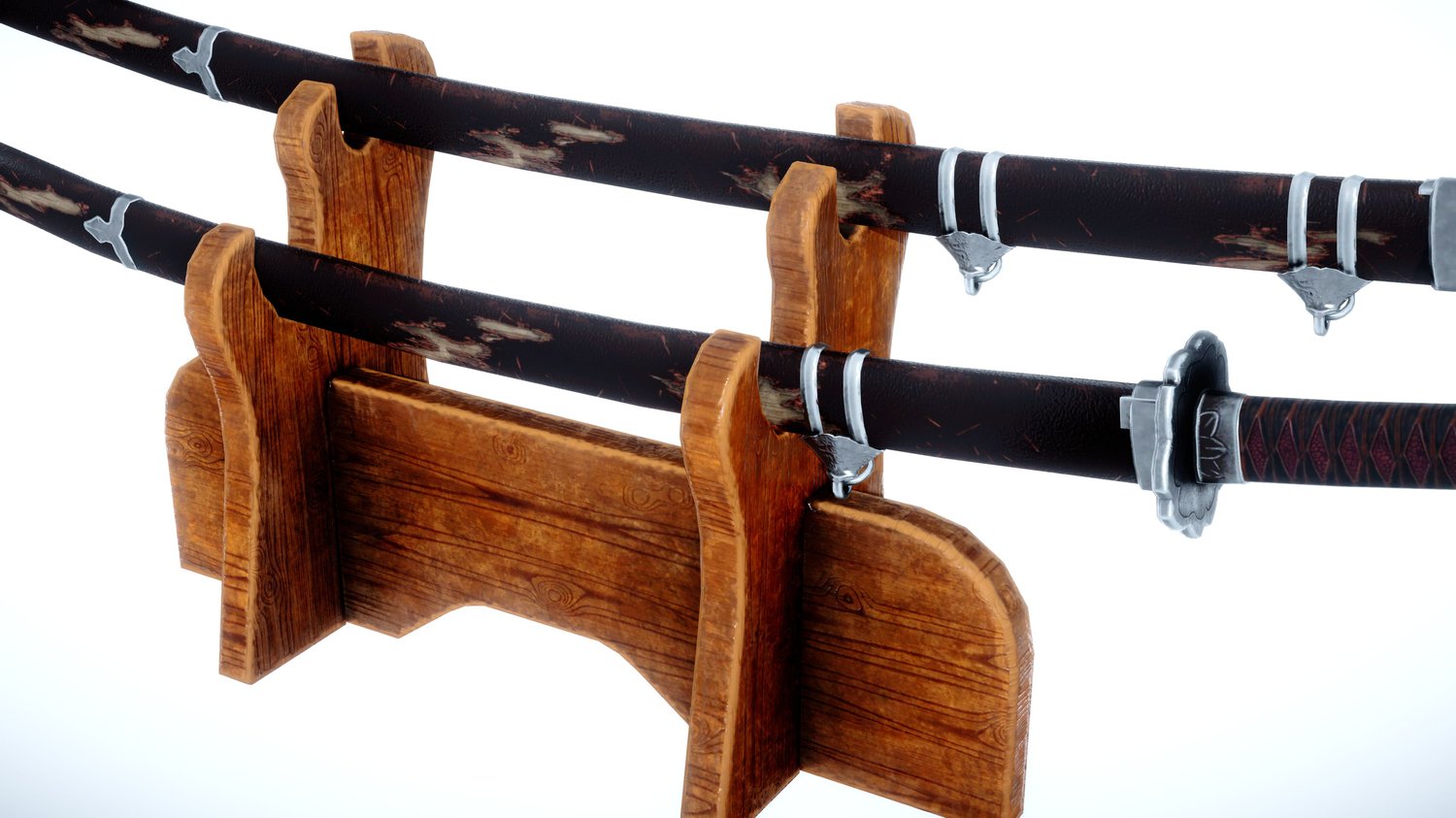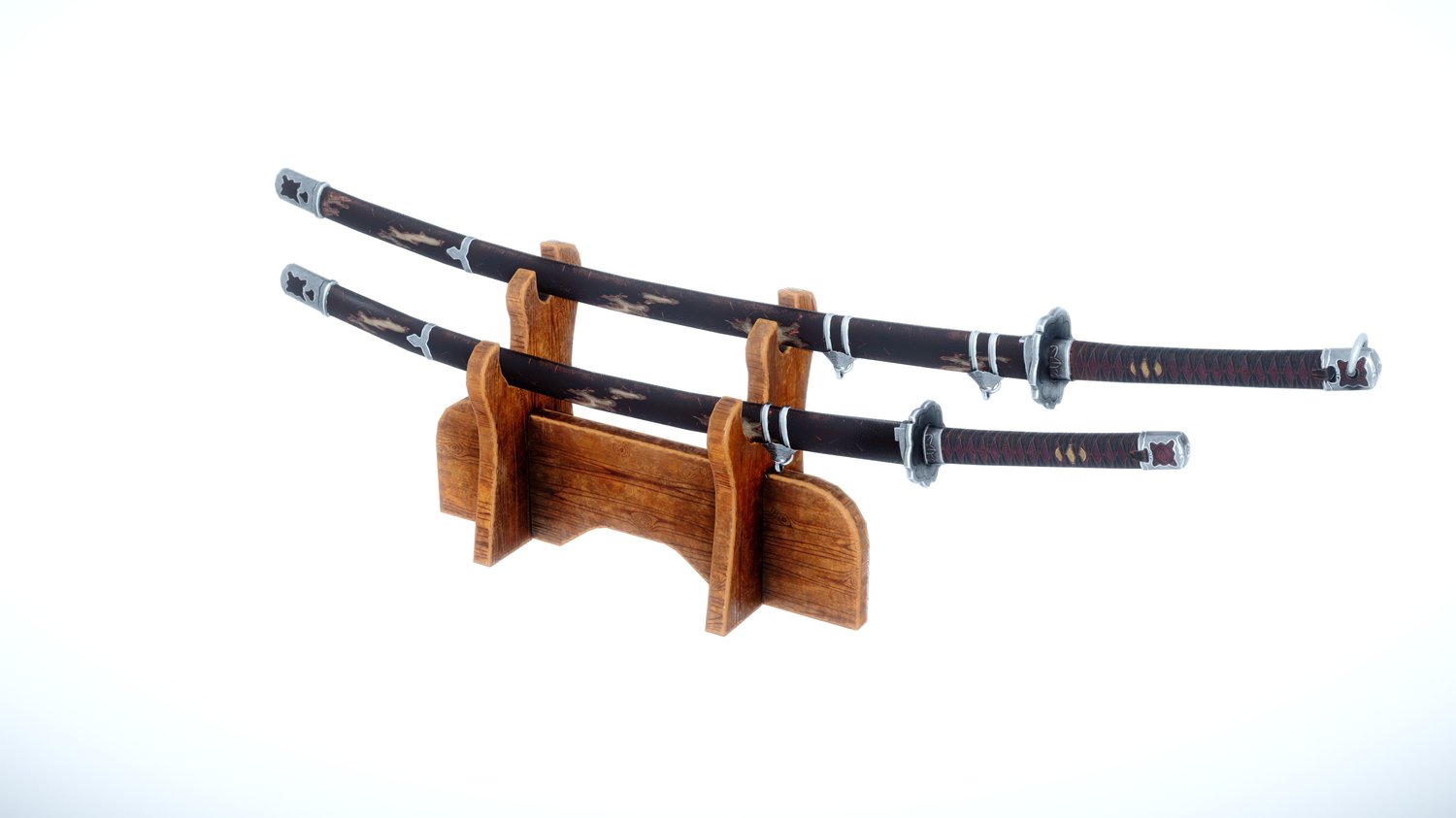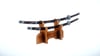 Presenting a simple yet elegant wooden stand that artfully houses two katanas – one long and one short. The scabbards of these blades are intricately crafted in wood, adding an authentic and artisanal touch.