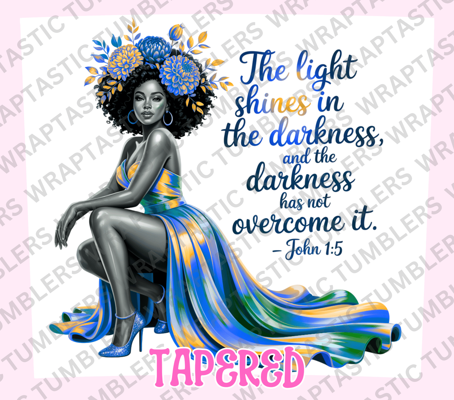 Inspirational Christian tumbler wrap PNG featuring John 1:5 — “The light shines in the darkness.” Perfect for faith-based crafts, shirts & mugs.