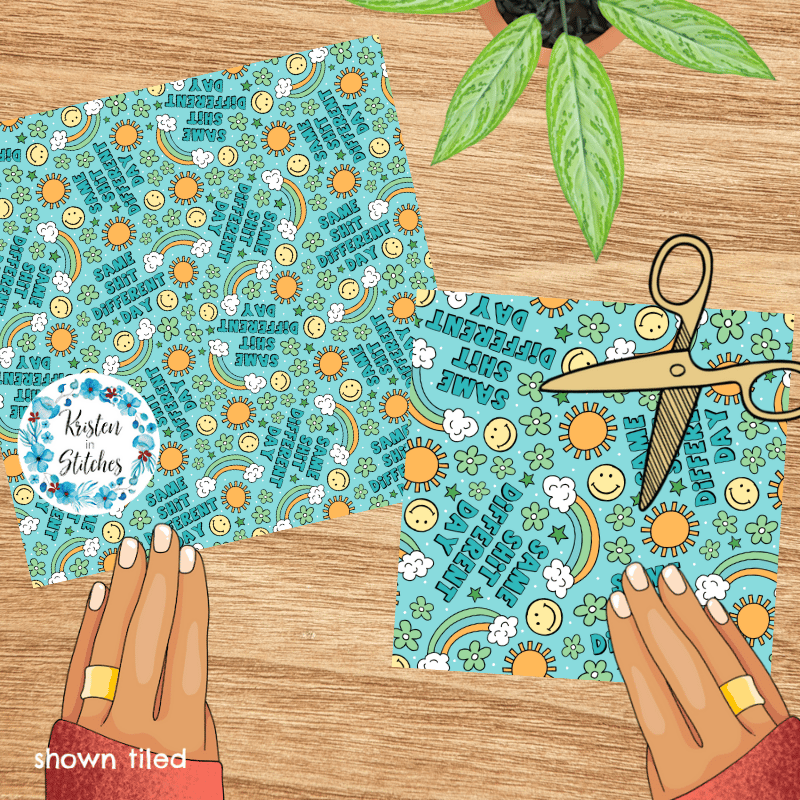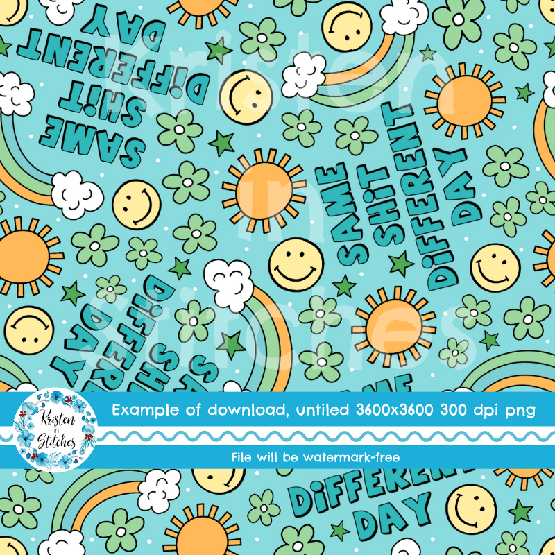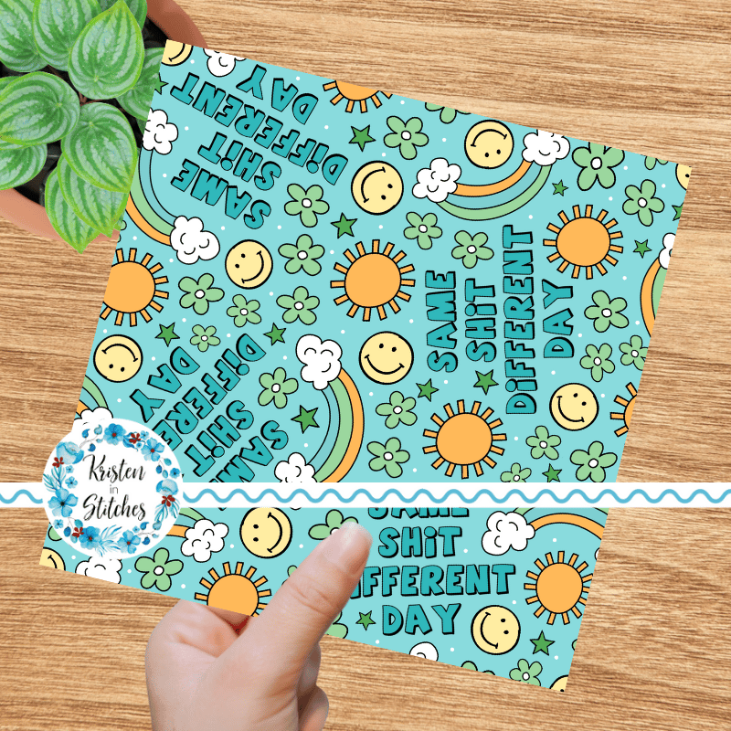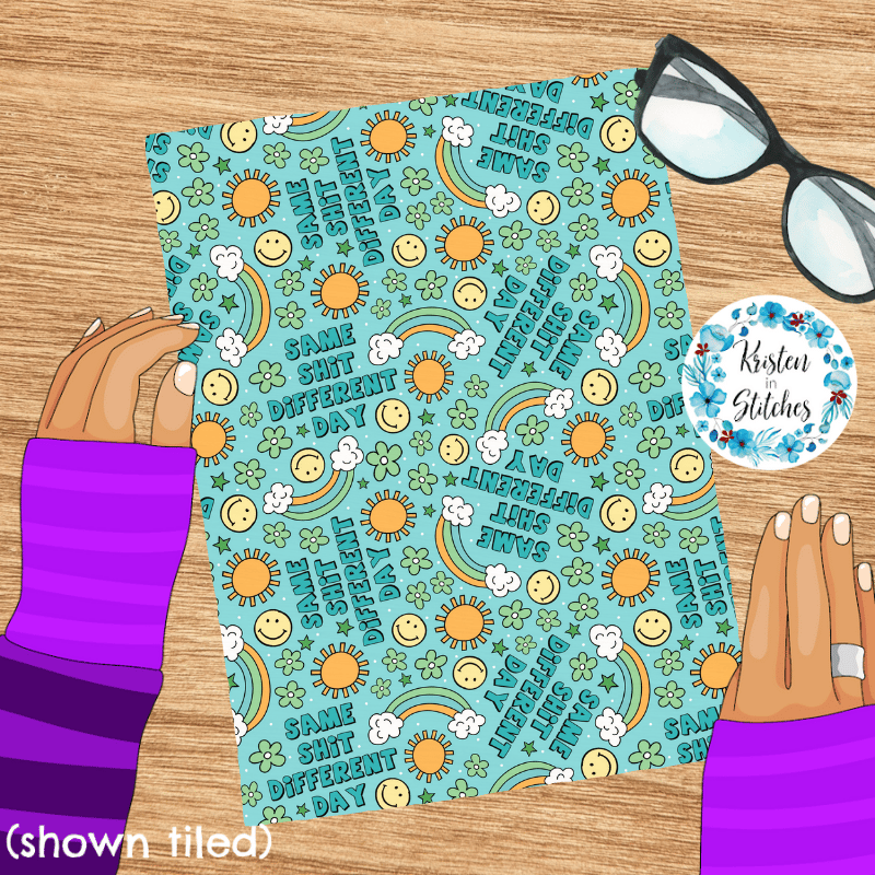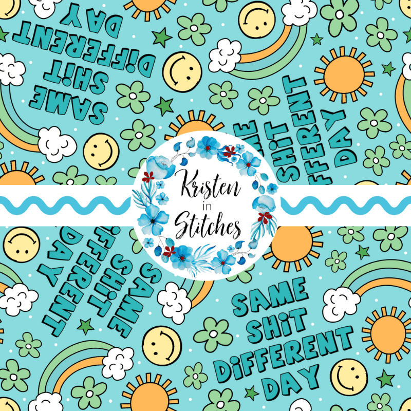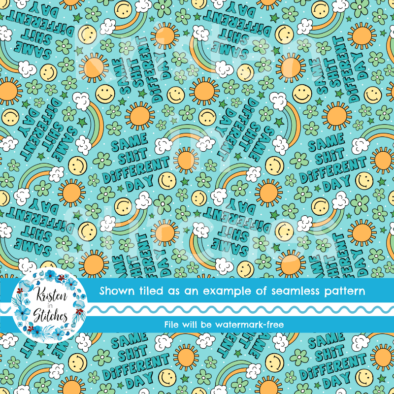 Same Shit Different Day Swear Word Seamless Pattern, Pretty Profanities, Rainbows and Sunshine, Blue