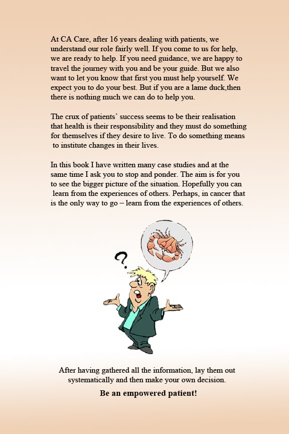 I am aware that there are already many books written about cancer. You might have probably read some of them or none at all. I am also aware that you have no time to read because you are made busy having to run around undergoing and coping with your treatments. I am also aware that after being diagnosed with cancer you are overwhelmed with all kinds of expert advices given by well-meaning friends and relatives. Perhaps you have come to a stage where you are now confused or fed-up with what they tell you and therefore you do not have any more appetite for more information. I remember the wife of a lawyer who came to seek my help. When I asked her to read some of my books, she answered: I have read many books already and I know enough! I am also aware that some people don’t like to read books! Such people prefer that the experts lead them by the nose.