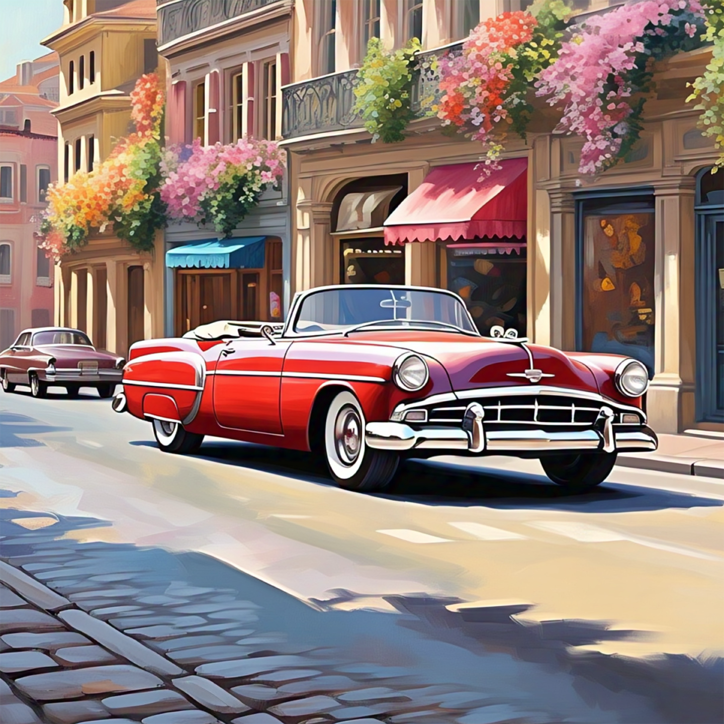 This vibrant artwork captures a slice of European city charm and nostalgic elegance through a bright, expressive digital painting style. The focus is a magnificent vintage red convertible, depicted cruising down a sunlit cobbled street, its chrome details gleaming. The car's deep crimson color is beautifully contrasted by the warm, pastel facades of the buildings that line the street, which are draped with lush boxes of pink, orange, and yellow trailing flowers. The scene is saturated with sunlight, casting long, sharp shadows across the pavement and highlighting the warm tones of the classic architecture. This piece evokes a feeling of romantic travel and carefree, stylish nostalgia, transporting the viewer to a perfect summer day in a picturesque setting.