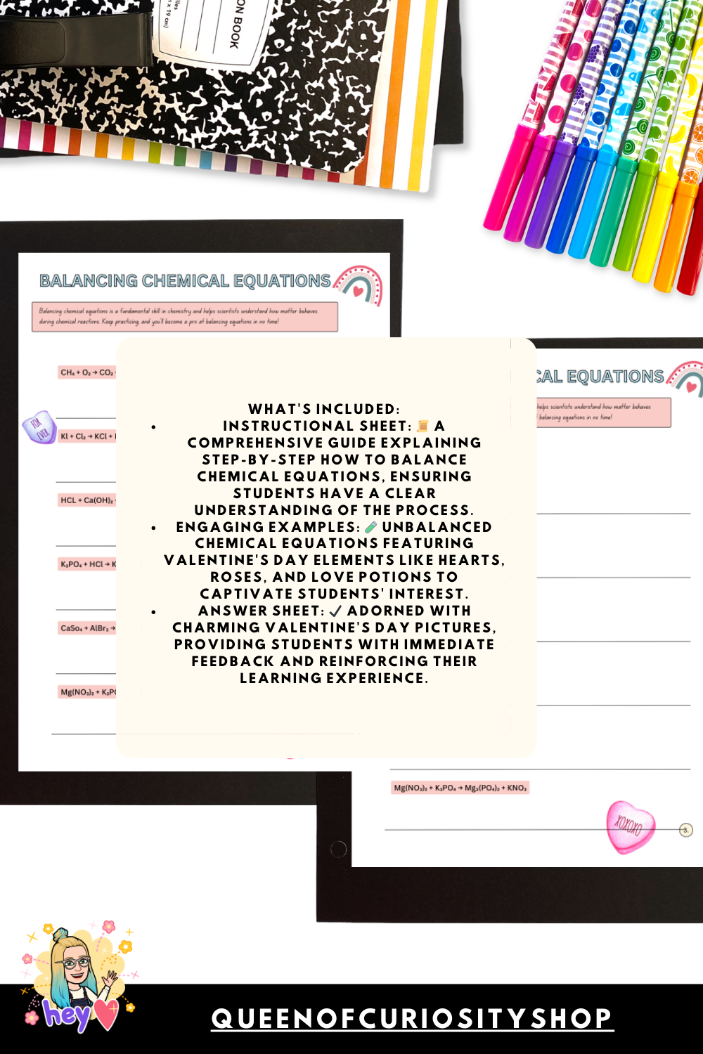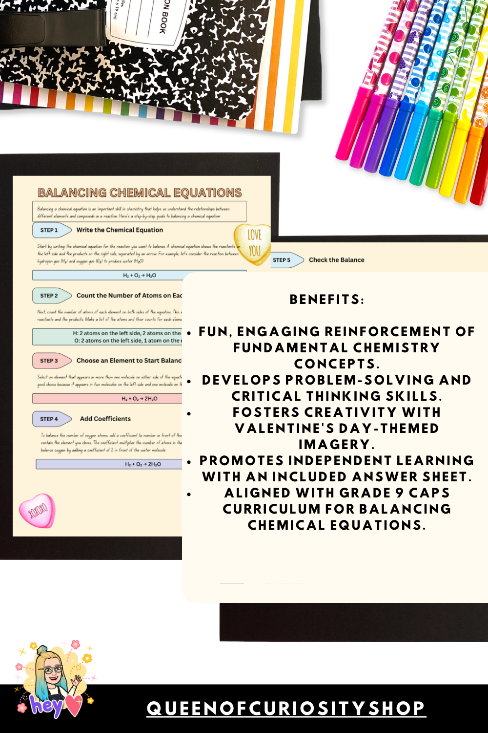 Celebrate the magic of chemistry this Valentine's Day with this engaging Chemical Equation Balancing Activity! ⚗️ This activity sheet guides students through balancing chemical equations while incorporating delightful Valentine's Day themes and imagery. From chocolates to roses, students will be immersed in love-inspired chemical reactions as they hone their equation-balancing skills.