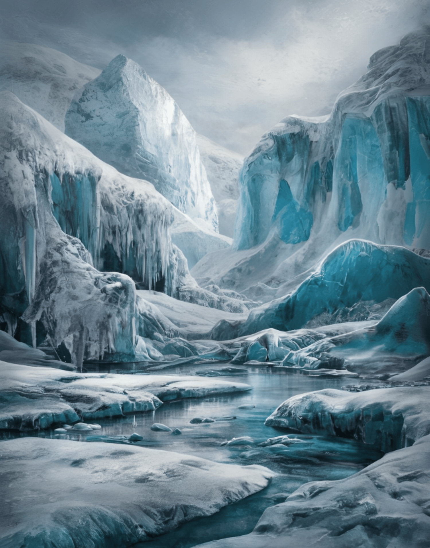 Frozen Landscape, Frozen River, Antertica, Ice Mountain Ice Cave, Painting.