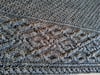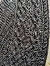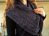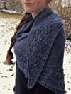 Hearthstone is an asymmetrical triangular shawl knit on the bias. It features a richly textured body and an intricate cable that runs along the bottom edge. The shawl begins with a provisional i-cord cast-on, from which extra stitches are picked up to form the shawl body. Once the cable is established, increases are made along one edge until desired size is achieved.