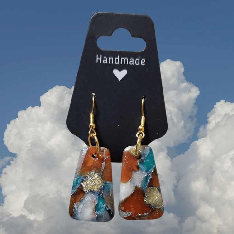 Handmade polymer clay dangles featuring a sand-gold pendant embossed with an ancient-style hieroglyphic pattern. The textured, geometric pendant hangs from a brass-tone post, giving it an earthy, Egyptian-inspired look. Lightweight, eye-catching, and perfect as a statement piece or unique gift.