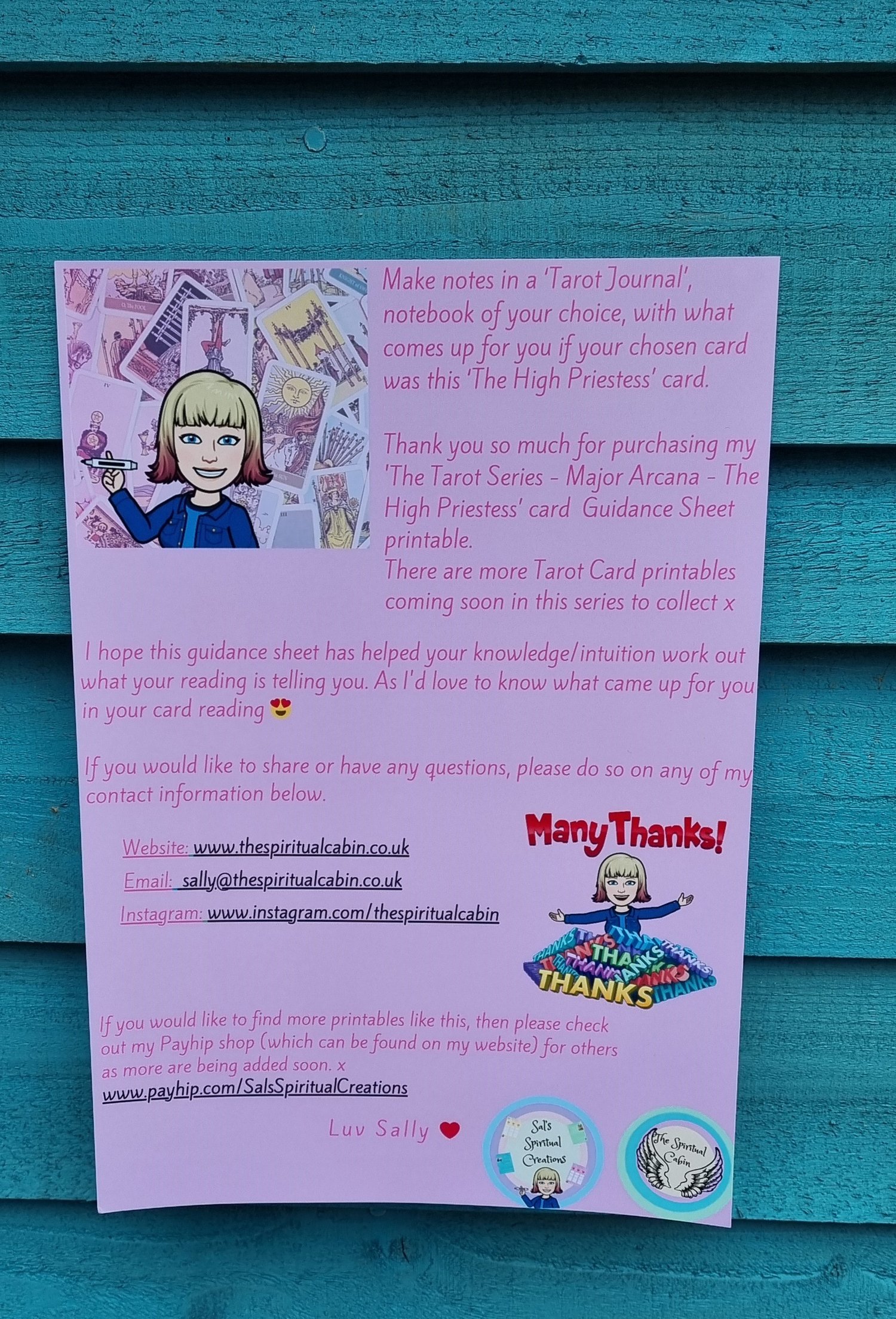 2nd Sheet - Pink background with description on how to use this High Priestess Tarot Card guidance sheet, plus my emoji designs of me, 'The Spiritual Cabin' and Payhip Shop logos. Also information about both incase you need to contact me.