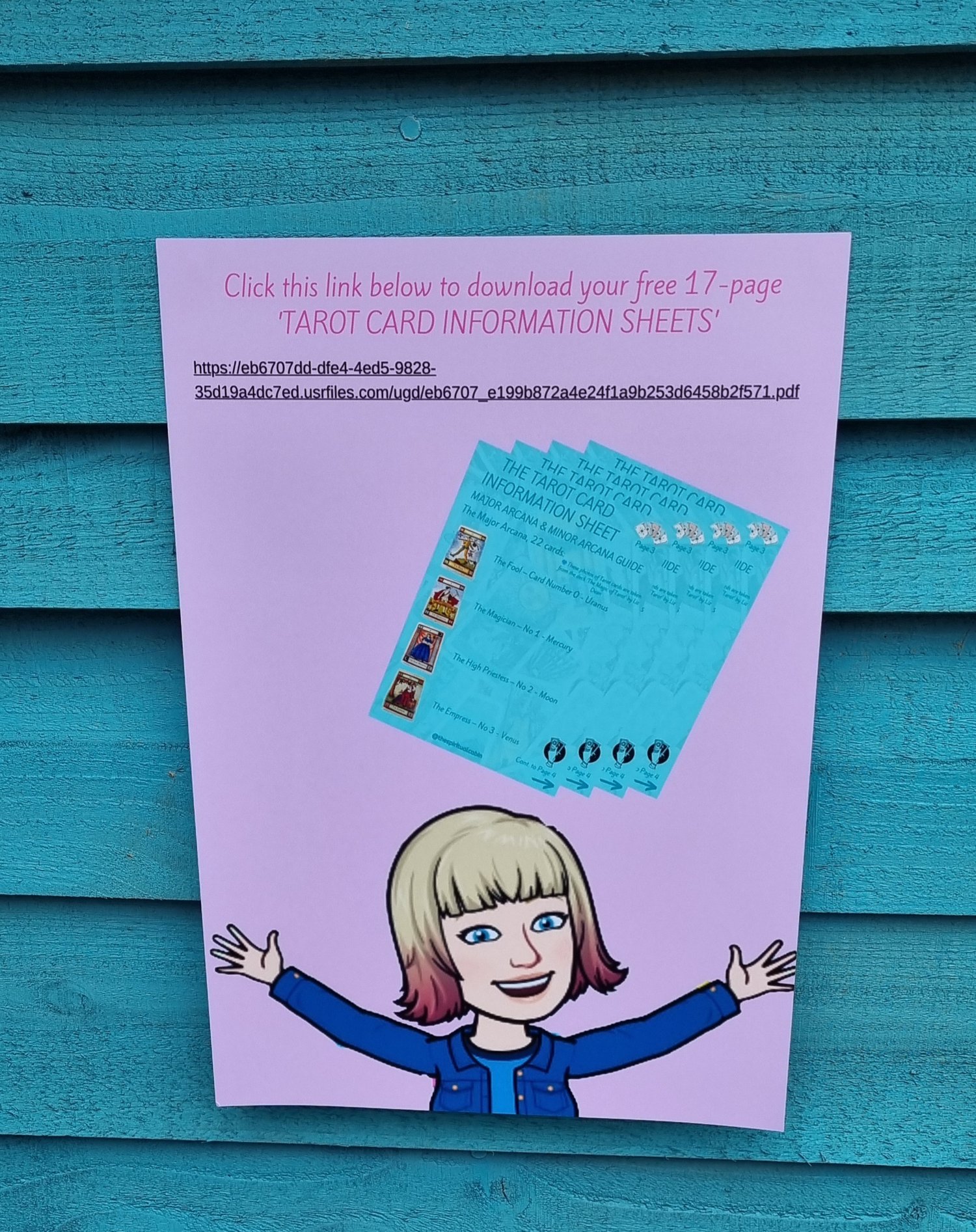 3rd Sheet - Pink background with emoji of me and link to download free 17-page Tarot Card Information Booklet to help identify your Tarot cards while doing a reading.