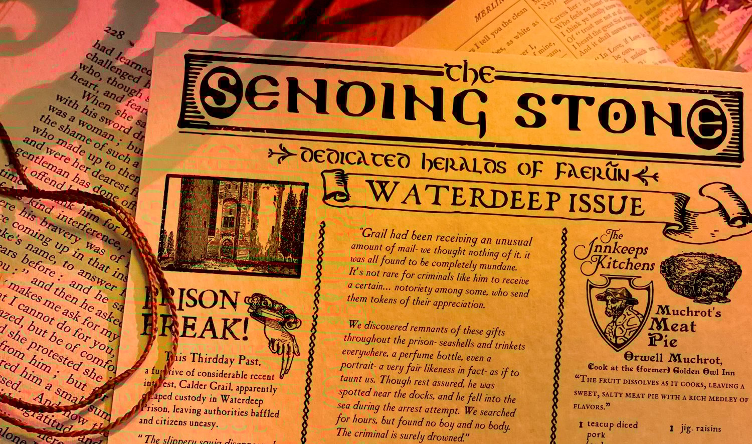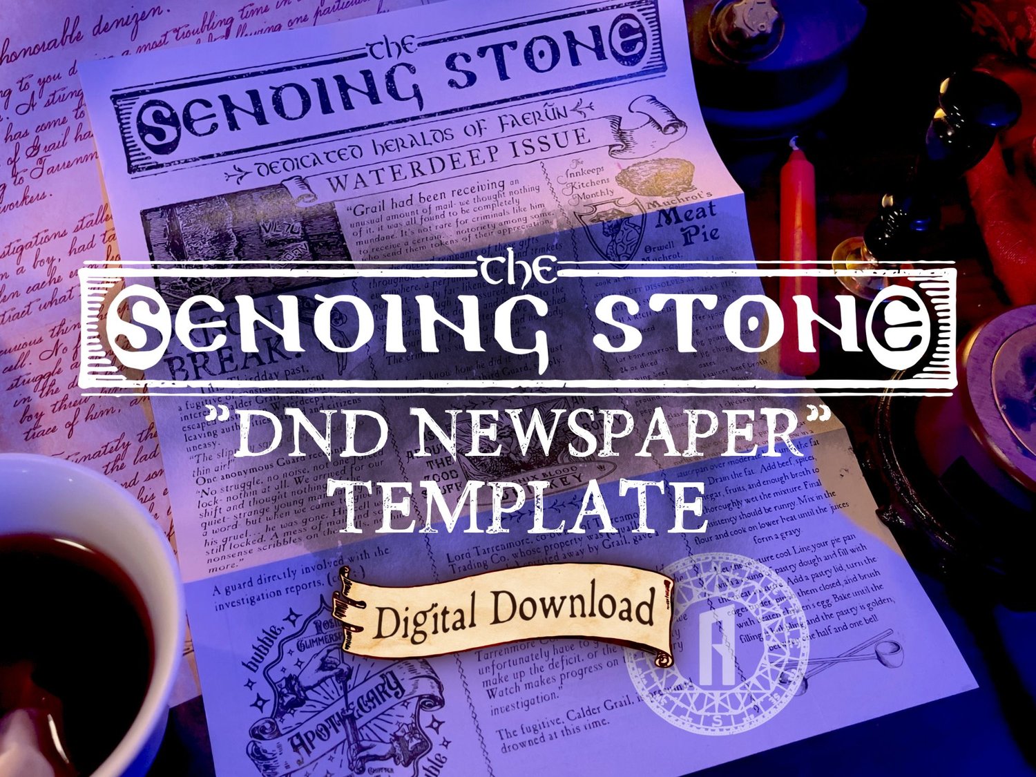"The Sending Stone" Is a fictional DnD / Medieval Fantasy themed newspaper made by Trystan Hawthorne aka "Azrai," which is fully editable in Canva with a free account.
