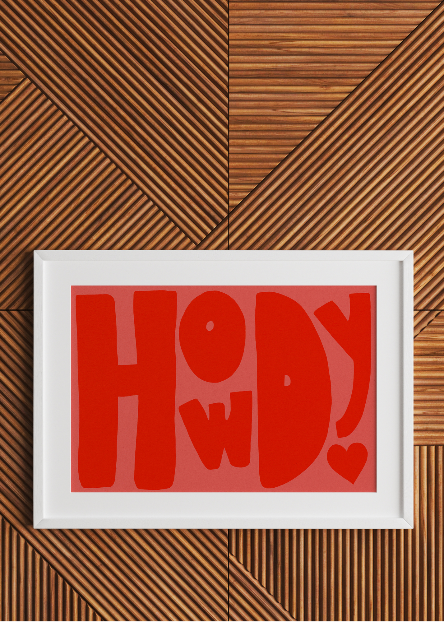 Howdy— This print is bold, playful, and absolutely packed with personality. A dusty pink red background sets the stage for the hand-drawn lettering of “Howdy” in a brilliant cherry red—complete with a sweet little heart for extra charm. It’s the kind of greeting that kicks off good stories, invites laughter, and brings a little Southern sass wherever it hangs.