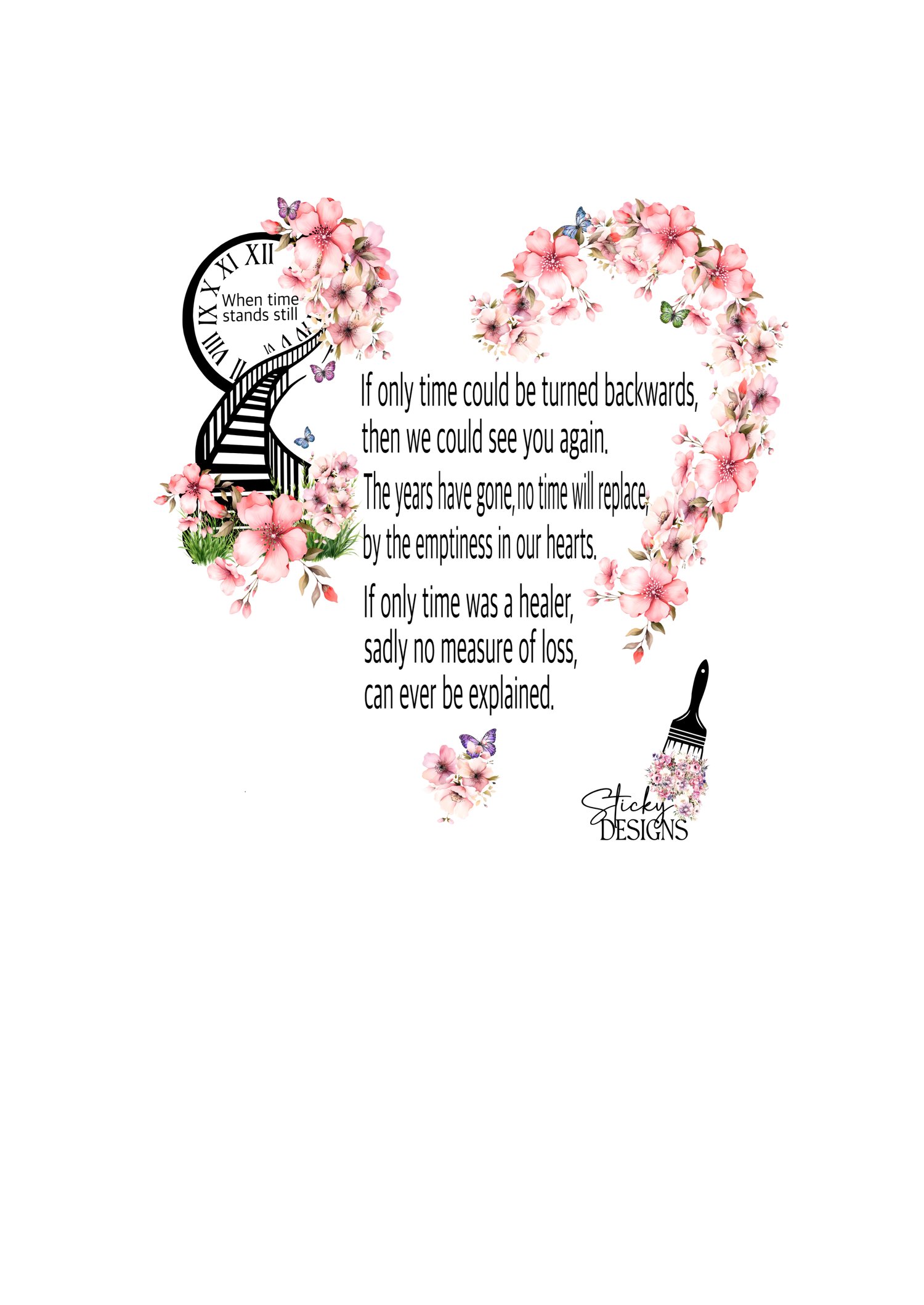 When time stands still, heart shape design with poem, it comes with a base which the heart slots into, there is a hole for a battery tea light, also comes with a free size heart, which will give you scope to put on other products.