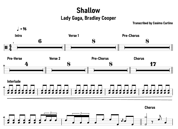 Shallow - Lady Gaga, Bradley Cooper Full Drum Transcription in PDF