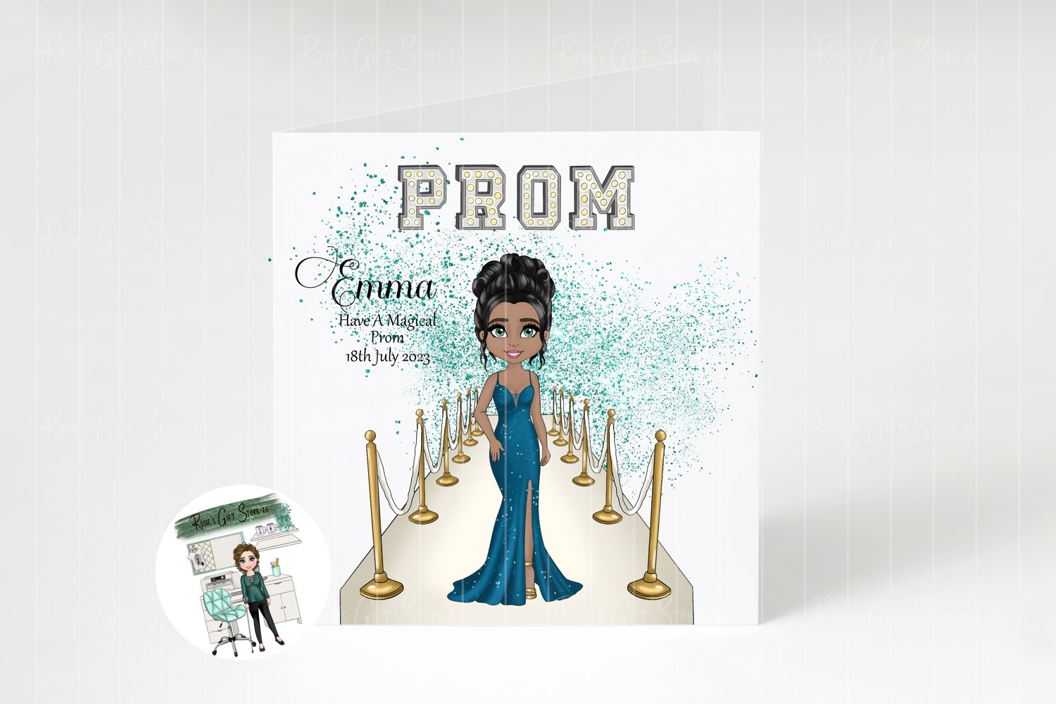 Personalised Prom card for her, Teal dress, 5 hair style 7 hair colours