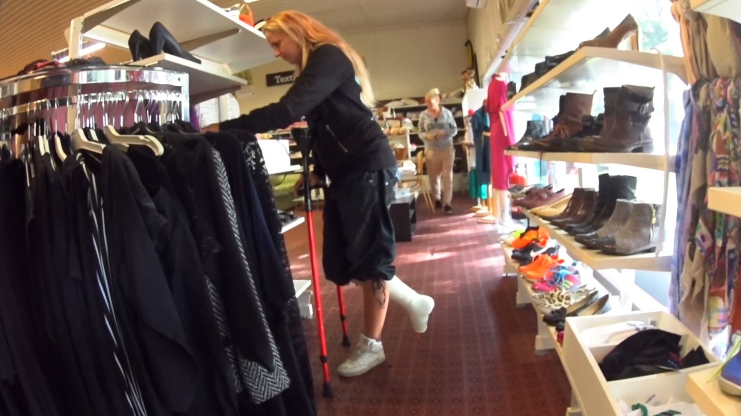 We meet Alva jumping on crutches with her right leg in a short leg cast.She crutch into a store that sells used items, china, ornaments, clothes, shoes and books.Alva carefully passes all the shelves with delicate crockery of various kinds and further into the shop where she finds both shoes and clothes.She may be interested in something because there is nothing wrong with them and they are very cheap.