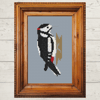 A counted cross stitch pattern of a great spotted woodpecker. One of the three species of woodpecker found in the UK, they can be heard drumming in woods in the spring.