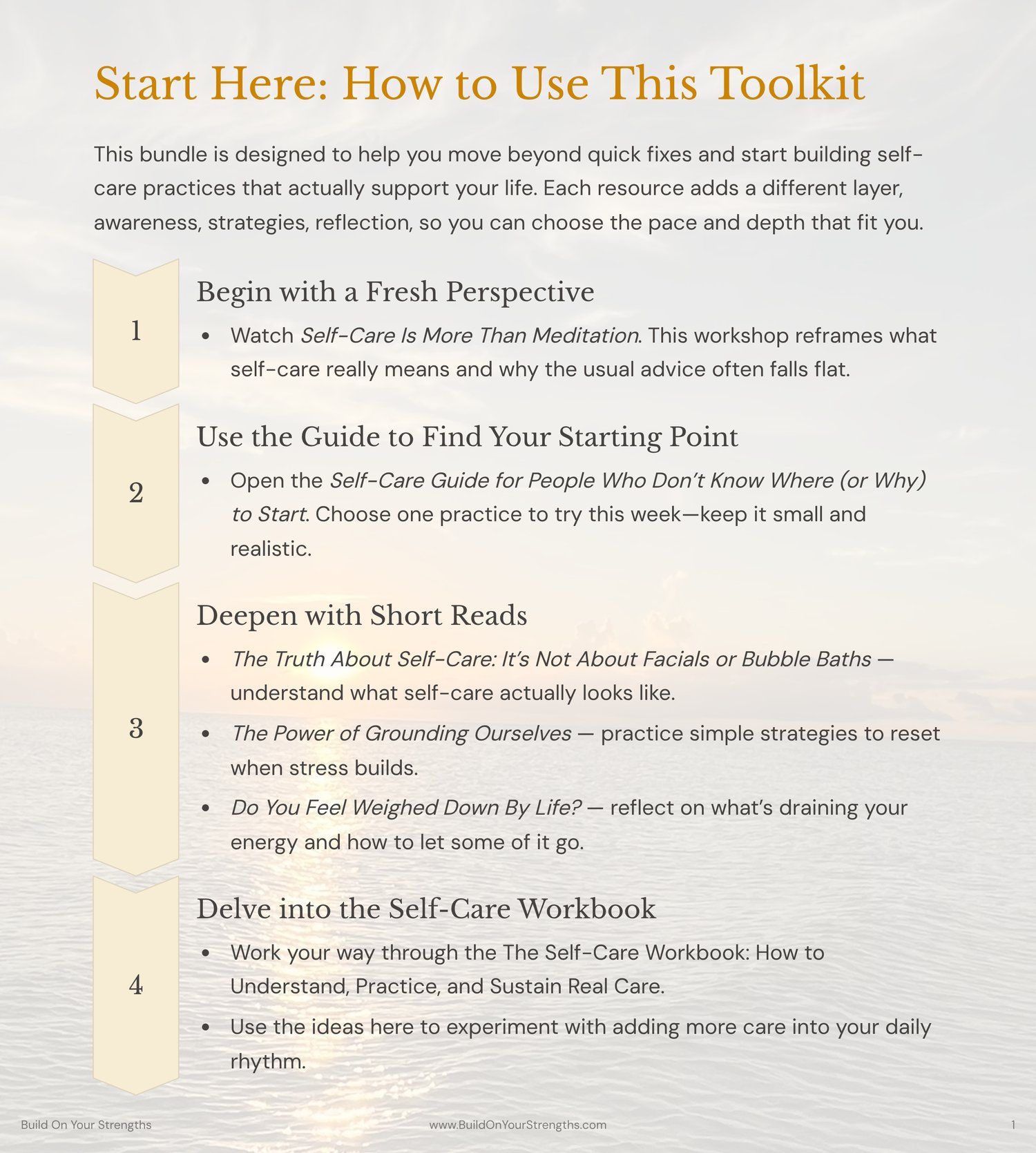 This bundle combines a workshop recording, a starter guide, a 35+ page workbook, and three short readings to help you rethink self-care and make it sustainable. You’ll learn how to create practices that fit your real life, find rest through better sleep, and use simple grounding strategies when stress builds.