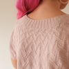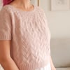 Moonflower Tee is worked from the top down seamlessly with the round yoke. The neck is shaped with short rows. This design features cable-looking traveling stitches - a combination of increases and decreases that has an appearance of cables while being much easier to knit and resulting in a lighter fabric. The main stitch pattern is easy to memorize and entertaining to knit. Instructions are both charted and written.