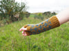 The thumb is separated using waste yarn, and at the end stitches are picked-up over and under the waste yarn to work the thumb in ribbing. They are available in 2 sizes to fit a wide range of adult hands.